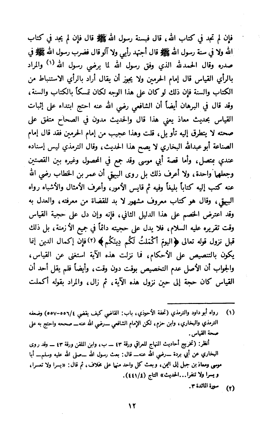 ١ رواه أبو داود وانرمذي "تحفة الأحوذي باب القاضي كيف يقضي ٤/٥٥٦- ٥٥٧"وضعفه الترمذي والبخاري وابن حزم لكن الإمام الشافعي رضي الله عنه صححه واحتجة به علي صحة القياس