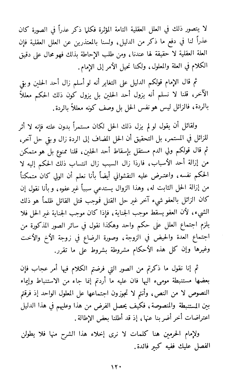 لا يتصور ذلك في العلل العقلية التامة المؤثرة فكلما ذكر عذرا في الصورة كان عذرا لنا في دفع ما ذكر من الدليل ولسنا بالمعتذرين عن العلل العقلية فإن العلة العقلية لا حقيقة لها عندنا ومن طلب الإحاطة بذلك فهو محال على دقيق الكلام في العلة والمعلول ولكنا نحيل الأمر إلى الإمام