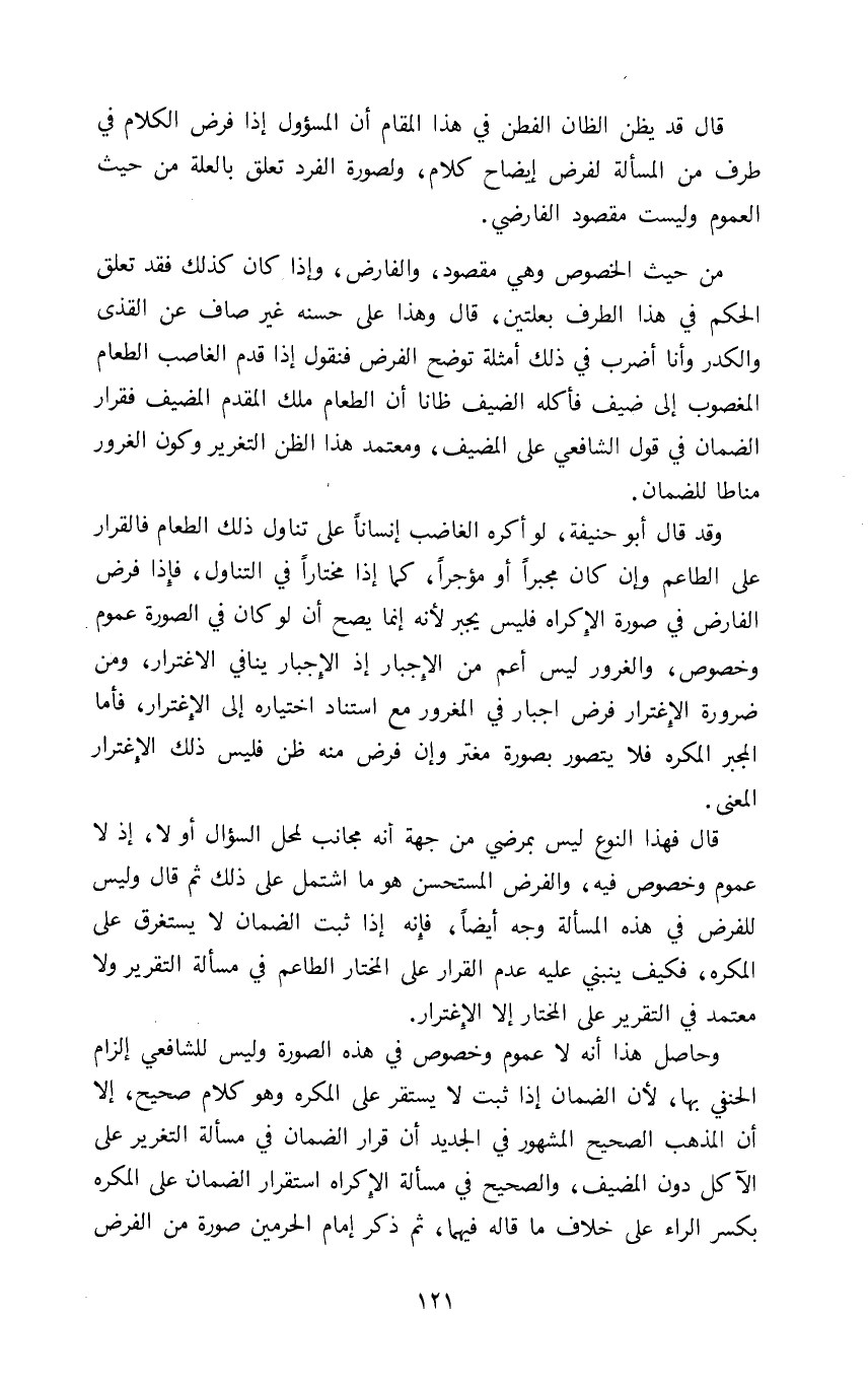 وحاصل هذا أنه لا عموم وخصوص في هذه الصورة وليس للشافعي إلزام الحنفي بها لأن الضمان إذا ثبت لا يستقر على المكره وهو كلام صحيح إلا أن المذهب الصحيح المشهور في الجديد أن قرار الضمان في مسألة التغرير على الآكل دون المضيف والصحيح في مسألة الإكراه استقرار الضمان على المكره بكسر الراء على خلاف ما قاله فيهما ثم ذكر إمام الحرمين صورة من الفرض