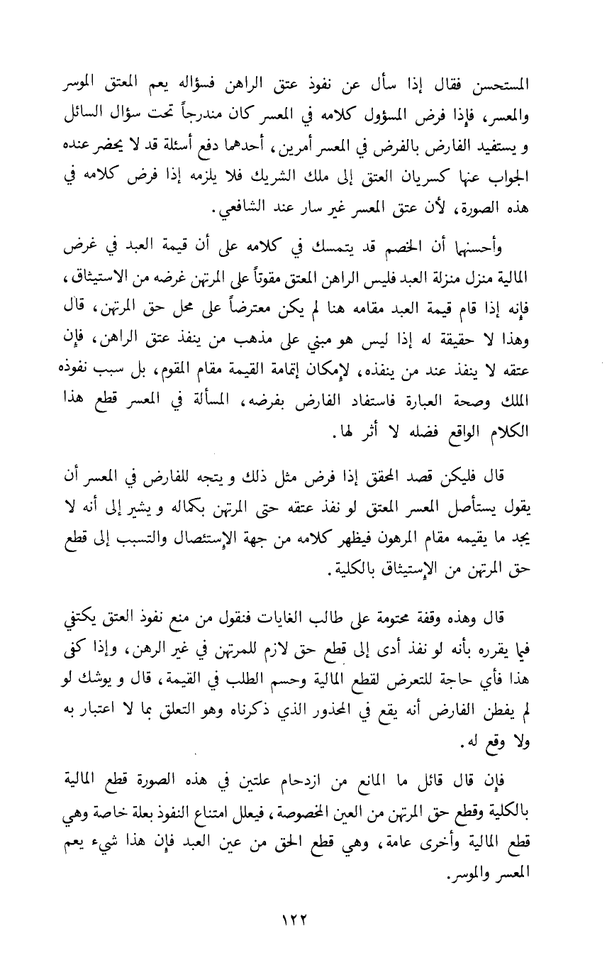 فإن قال قائل ما المانع من ازدحام علتين في هذه الصورة قطع المالية بالكلية وقطع حق المرتهن من العين المخصوصة فيعلل امتناع النفوذ بعلة خاصة وهي قطع المالية وأخرى عامة وهي قطع الحق من عين العبد فإن هذا الشيء يعم المعسر والموسر