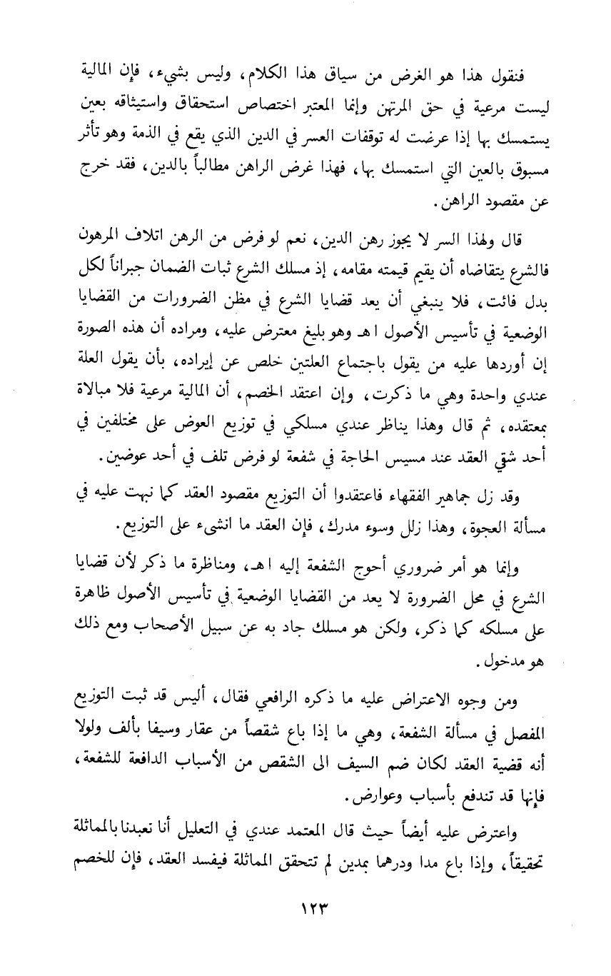 قال ولهذا السر لا يجوز رهن الدين نعم لو فرض من الرهن إتلاف المرهون فالشرع يتقاضاه أن يقيم قيمته مقامه إذ مسلك الشرع ثبات الضمان جبرانا لكل بدل فائت فلا ينبغي أن يعد قضايا الشرع في مظن الضرورات من القضايا الوضعية في تأسيس الأصول اه وهو بليغ معترض عليه ومراده أن هذه الصورة إن أوردها عليه من يقول باجتماع العلتين خلص عن إيراده بأن يقول العلة عندي واحدة وهي ما ذكرت وإن اعتقد الخصم أن المالية مرعية فلا مبالاة بمعتقده ثم قال وهذا يناظر عندي مسلكي في توزيع العوض على مختلفين في أحد شقي العقد عند مسيس الحاجة في شفعة لو فرض تلف في أحد عوضين