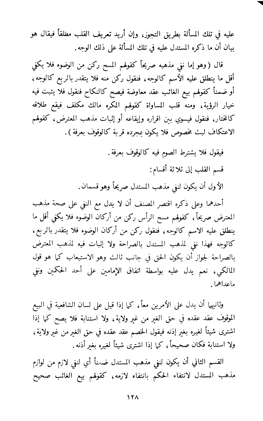 قال "وهو إما نفي مذهبه صريحا كقولهم المسح ركن من الوضوء فلا يكفي أقل ما ينطلق عليه الاسم كالوجه فنقول ركن منه فلا يتقدر بالربع كالوجه أو ضمنا كقولهم بيع الغائب عقد معاوضة فيصح كالنكاح فنقول فلا يثبت فيه خيار الرؤية ومنه قلب المساواة كقولهم المكره مالك مكلف فيقع طلاقه كالمختار فنقول فيسوي بين إقراره وإيقاعه أو إثبات مذهب المعترض كقولهم الاعتكاف لبث مخصوص فلا يكون بمجرد قربة كالوقوف بعرفة"