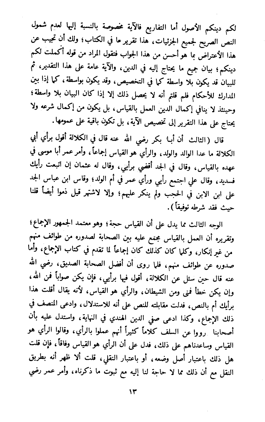 لكم دينكم الأصول أما التفاريع فالآية مخصوصة بالنسبة إليها لعدم شمول النص الصريح لجميع الجزئيات هذا تقرير ما في الكتاب ولك أن تجيب عن هذا الاعتراض بما هو أحسن من هذا الجواب فتقول المراد من قوله أكملت لكم دينكم بيان جميع ما يحتاج إليه في الدين والآية عامة على هذا التقدير ثم للبيان قد يكون بلا واسطة كما في التخصيص وقد يكون بواسطة كما إذا بين المدارك للأحكام فلم قلتم أنه لا يحصل ذلك إلا إذا كان البيان بلا واسطة وحينئذ لا ينافي إكمال الدين العمل بالقياس بل يكون من إكمال شرعه ولا يحتاج على هذا التقرير إلى تخصيص الآية بل تكون باقية على عمومها