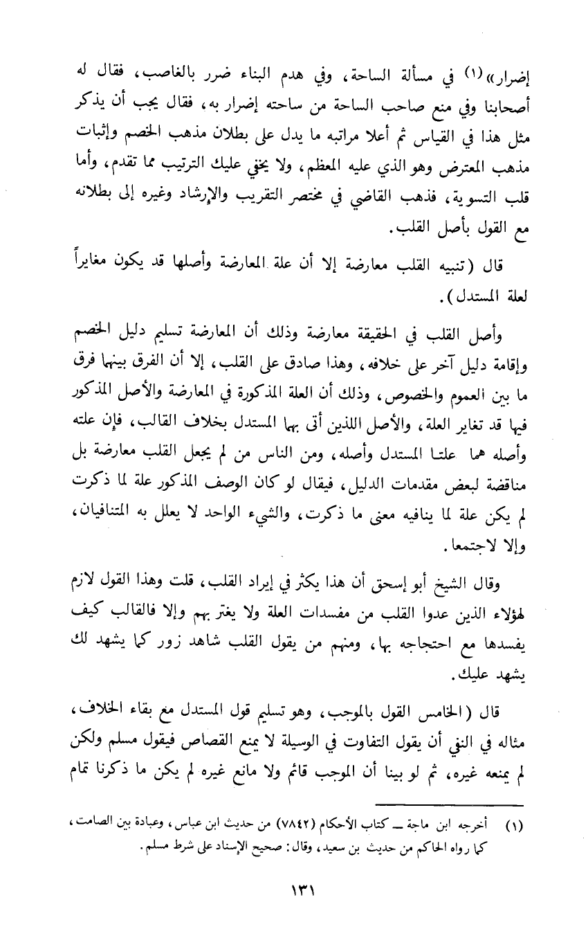 إضرار١" في مسألة الساحة وفي هدم البناء ضرر بالغاصب فقال له أصحابنا وفي منع صاحب الساحة من ساحته إضرار به فقال يجب أن يذكر مثل هذا في القياس ثم أعلا مراتبه ما يدل على بطلان مذهب الخصم وإثبات مذهب المعترض وهو الذي عليه المعظم ولا يخفى عليك الترتيب مما تقدم وأما قلب التسوية فذهب القاضي في مختصر التقريب والإرشاد وغيره إلى بطلانه مع القول بأصل القلب
