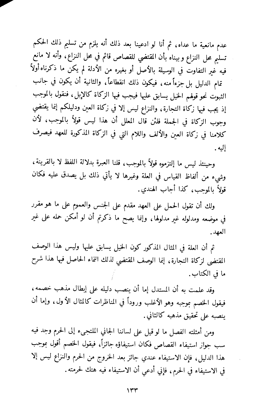عدم مانعية ما عداه ثم أنا لو ادعينا بعد ذلك أنه يلزم من تسليم ذلك الحكم تسليم محل النزاع وبيناه بأن المقتضي للقصاص قائم في محل النزاع وأنه لا مانع فيه غير التفاوت في الوسيلة بالأصل أو بغيره من الأدلة لم يكن ما ذكرناه أولا تمام الدليل بل جزءا منه فيكون ذلك انقطاعا والثانية أن يكون في جانب الثبوت نحو قولهم الخيل يسابق عليها فيجب فيها الزكاة كالإبل فنقول بالموجب إذ يجب فيها زكاة التجارة والنزاع ليس الا في زكاة العين ودليلكم إنما يقتضي وجوب الزكاة في الجملة فلئن قال المعلل أن هذا ليس قولا بالموجب لأن كلامنا في زكاة العين والألف واللام التي في الزكاة المذكورة للعهد فيصرف إليه