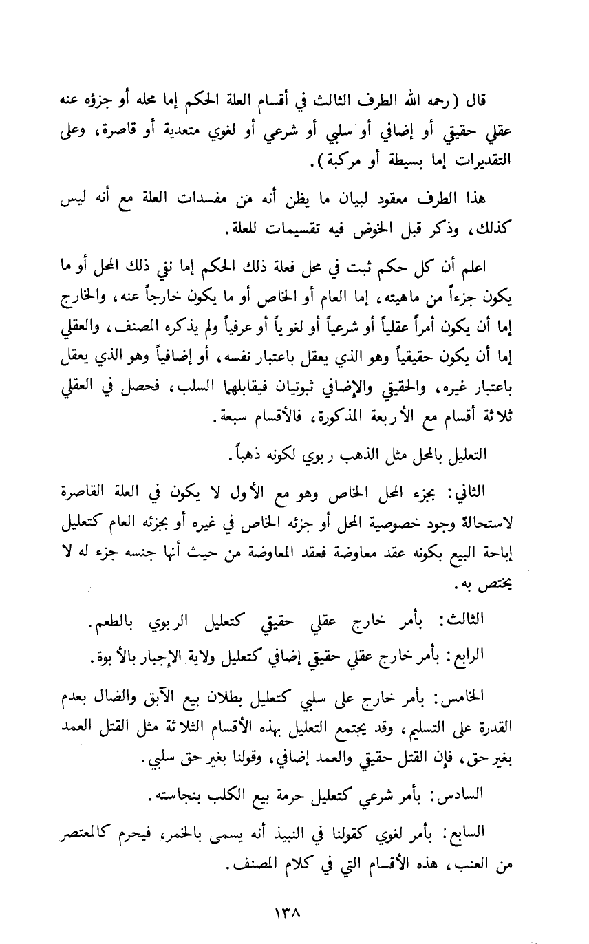 الخامس بأمر خارج على سلبي كتعليل بطلان بيع الآبق والضال بعدم القدرة على التسليم وقد يجتمع التعليل بهذه الأقسام الثلاثة مثل القتل العمد بغير حق فإن القتل حقيقي والعمد إضافي وقولنا بغير حق سلبي