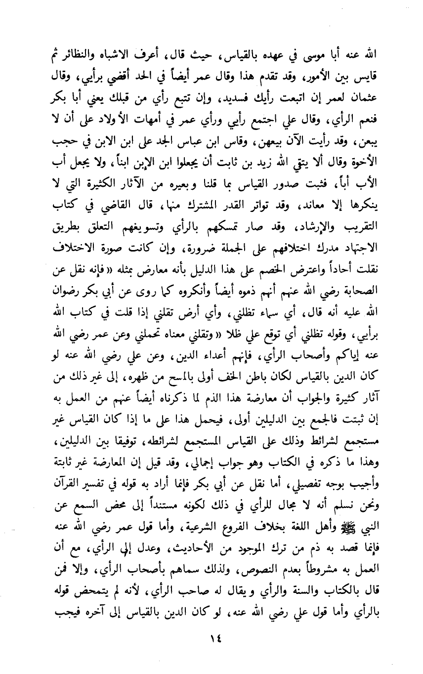 الله عنه أبا موسى في عهده بالقياس حيث قال أعرف الأشباه والنظائر ثم قايس بين الأمور وقد تقدم هذا وقال عمر أيضا في الحد أقضي برأيي وقال عثمان لعمر إن اتبعت رأيك فسديد وإن تتبع رأي من قبلك يعني أبا بكر فنعم الرأي وقال علي اجتمع رأيي ورأي عمر في أمهات الأولاد على أن لا يبعن وقد رأيت الآن بيعهن وقال ابن عباس الجد على ابن الابن في حجب الأخوة وقال ألا يتقي الله زيد بن ثابت أن يجعلوا ابن الابن ابنا ولا يجعل أب الأب أبا فثبت صدور القياس بما قلنا وبعيره من الآثار الكثيرة التي ينكرها إلا معاند وقد تواتر القدر المشترك منها قال القاضي في كتاب التقريب والإرشاد وقد صار تمسكهم بالرأي وتسويغهم التعلق بطريق الاجتهاد مدرك اختلافهم على الجملة ضرورة وإن كانت صورة الاختلاف نقلت آحادا واعترض الخصم على هذا الدليل بأنه معارض بمثله فإنه نقل عن الصحابة رضي الله عنهم أنهم ذموه أيضا وأنكروه كما روي عن أبي بكر رضوان الله عليه أنه قال أي سماء تظلني وأي أرض تقلني إذا قلت في كتاب الله برأيي وقوله تضلني وأي أرض تقلني معناه تحملني وعن عمر رضي الله عنه إياكم وأصحاب الرأي فإنهم أعداء الدين وعن علي رضي الله عنه لو كان الدين بالقياس لكان باطن الخف أولى بالمسح من ظهره إلى غير ذلك من آثار كثيرة والجواب أن معارضة هذا الذم لما ذكرناه أيضا عنهم من العمل به إن ثبتت فالجمع بين الدليلين أولى فيحمل هذا على ما إذا كان القياس غير مستجمع لشرائط وذلك على القياس المستجمع لشرائطه توفيقا بين الدليلين وهذا ما ذكره في الكتاب وهو جواب إجمالي وقد قيل إن المعارضة غير ثابتة وأجيب بوجه تفصيلي أما نقل عن أبي بكر فإنما أراد به قوله في تفسير القرآن ونحن نسلم أنه لا مجال للرأي في ذلك لكونه مستندا إلى محض السمع عن النبي صلى الله عليه وسلم وأهل اللغة بخلاف الفروع الشرعية وأما قول عمر رضي الله عنه فإنما قصد به ذم من ترك الموجود من الأحاديث وعدل إلى الرأي مع أن العمل به مشروطا بعدم النصوص ولذلك سماهم بأصحاب الرأي وإلا فمن قال بالكتاب والسنة والرأي ويقال له صاحب الرأي لأنه لم يتمحض قوله بالرأي وأما قول علي رضي الله عنه لو كان الدين بالقياس إلى آخره فيجب