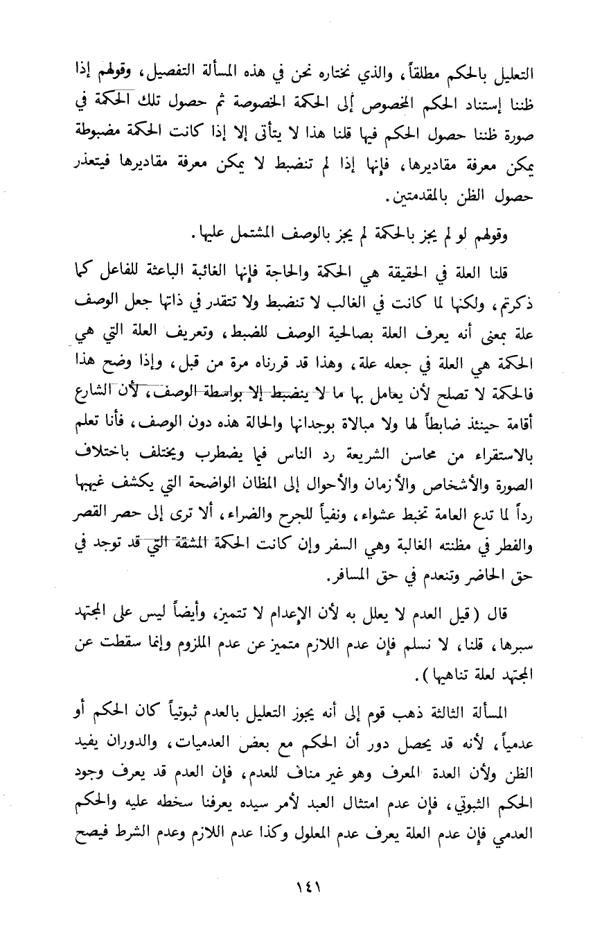 التعليل بالحكم مطلقا والذي نختاره نحن في هذه المسألة التفصيل وقولهم إذا ظننا استناد الحكم المخصوصة إلى الحكمة ثم حصول تلك الحكمة في صورة ظننا حصول الحكم فيها قلنا هذا لا يتأتى إلا إذا كانت الحكمة مضبوطة يمكن معرفة مقاديرها فإنها إذا لم تنضبط لا يمكن معرفة مقاديرها فيتعذر حصول الظن بالمقدمتين