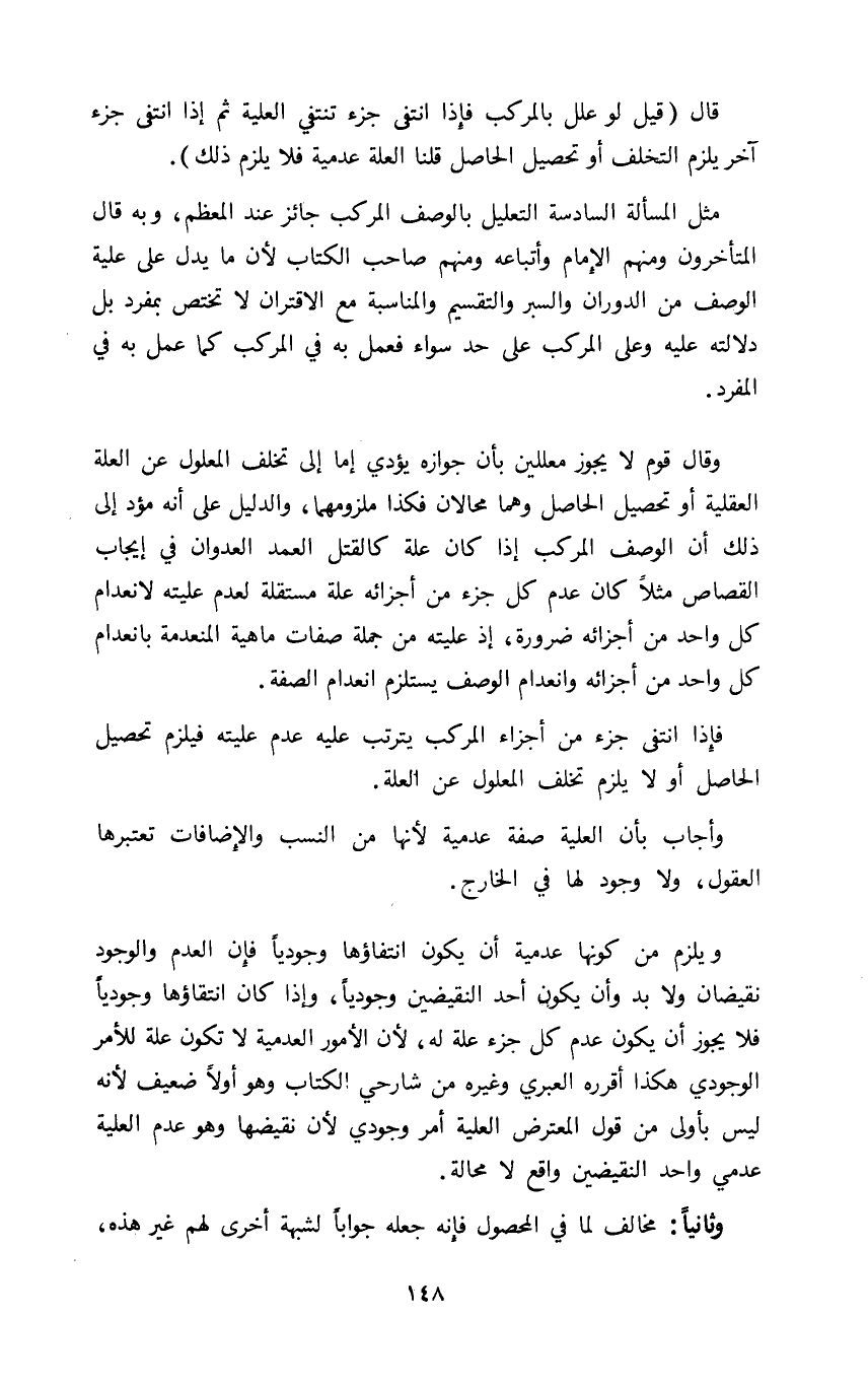 قال "قيل لو علل بالمركب فإذا انتفى جزء تنتفي العلية ثم إذا انتفى جزء آخر يلزم التخلف أو تحصيل الحاصل قلنا العلة عدمية فلا يلزم ذلك"