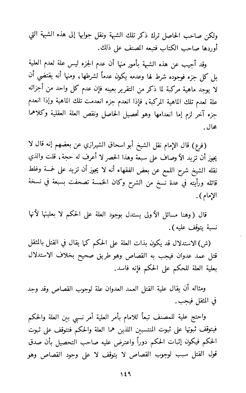 واحتج علية للمصنف تبعا للإمام بأمر العلية أمر نسبي بين العلة والحكم فيتوقف ثبوتها على ثبوت المنتسبين اللذين هما العلة والحكم فتتوقف على ثبوت الحكم فيكون إثبات الحكم دورا واعترض عليه صاحب التحصيل بأن صدق قول القتل سبب لوجوب القصاص لا يتوقف لا على وجود القصاص وهو