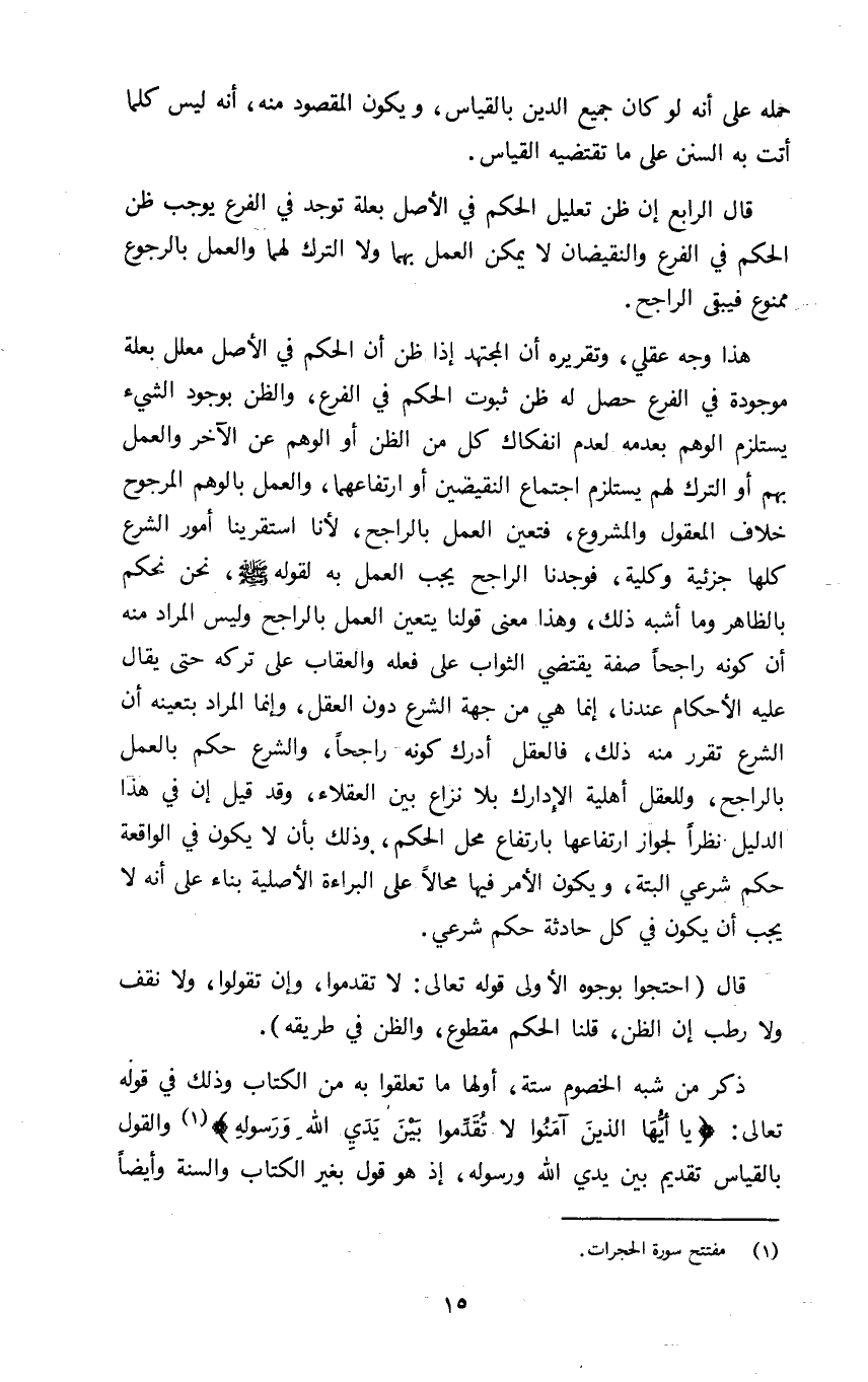 ذكر من شبه الخصوم ستة أولها ما تعلقوا به من الكتاب وذلك في قوله تعالى: {يَا أَيُّهَا الَّذِينَ آمَنُوا لا تُقَدِّمُوا بَيْنَ يَدَيِ اللَّهِ وَرَسُولِهِ١} والقول بالقياس تقديم بين يدي الله ورسوله إذ هو قول بغير الكتاب والسنة وأيضا