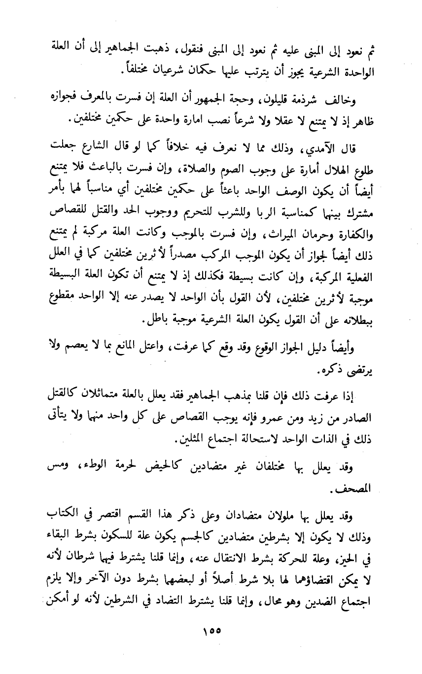 وخالف شرذمة قليلون وحجة الجمهور أن العلة إن فسرت بالمعرف فجوازه ظاهر إذ لا يمتنع لا عقلا ولا شرعا نصب إمارة واحدة على حكمين مختلفين