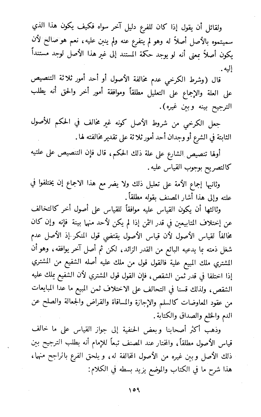 قال "وشرط الكرخي عدم مخالفة الأصول أو أحد أمور ثلاثة التنصيص على العلة والإجماع على التعليل مطلقا وموافقة أمور أخر والحق أنه يطلب الترجيح بينه وبين غيره"