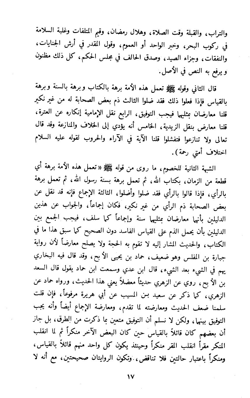 قال الثاني وقوله صلى الله عليه وسلم:"تعمل هذه الأمة برهة بالكتاب وبرهة بالسنة وبرهة بالقياس فإذا فعلوا ذلك فقد ضلوا" الثالث ذم بعض الصحابة له من غير نكير قلنا معارضان بمثليهما فيجب التوفيق الرابع نقل الإمامية إنكاره عن العترة قلنا معارض بنقل الزيدية الخامس أنه يؤدي إلى الخلاف والمنازعة وقد قال تعالى: {وَلا تَنَازَعُوا فَتَفْشَلُوا} قلنا الآية في الآراء والحروب لقوله عليه السلام:"اختلاف أمتي رحمة"