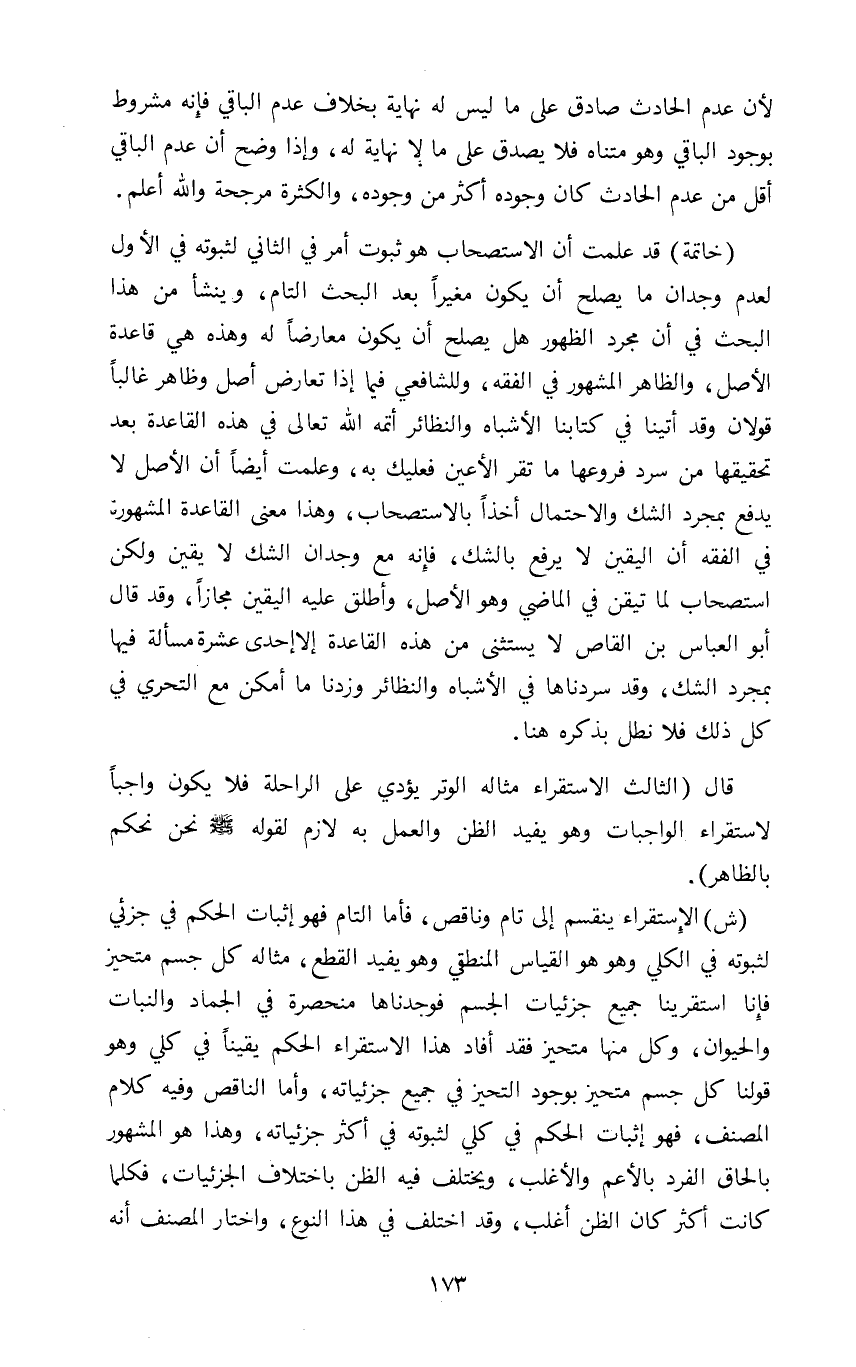 "خاتمة" قد علمت أن الاستصحاب هو ثبوت أمر في الثاني لثبوته في الأول لعدم وجدان ما يصلح أن يكون مغيرا بعد البحث التام وينشأ من هذا البحث في أن مجرد الظهور هل يصلح أن يكون معارضا له وهذه هي قاعدة الأصل والظاهر المشهور في الفقه وللشافعي فيما إذا تعارض أصل وظاهر غالبا قولان وقد أتينا في كتابنا الأشباه والنظائر أتمه الله تعالى في هذه القاعدة بعد تحقيقها من سرد فروعها ما تقر الأعين فعليك به وعلمت أيضا أن الأصل لا يدفع بمجرد الشك والاحتمال أخذا بالاستصحاب وهذا معنى القاعدة المشهورة في الفقه أن اليقين لا يرفع بالشك فإنه مع وجدان الشك لا يقين ولكن استصحاب لما تيقن في الماضي وهو الأصل وأطلق عليه اليقين مجازا وقد قال أبو العباس بن القاص لا يستثنى من هذه القاعدة إلا إحدى عشرة مسألة فيها بمجرد الشك وقد سردناها في الأشباه والنظائر وزدنا ما أمكن مع التحري في كل ذلك فلا نطل بذكره هنا
