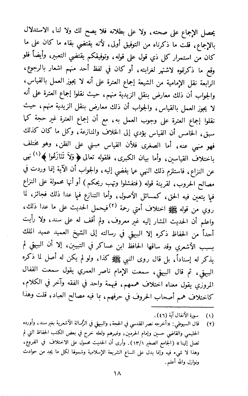 يحصل الإجماع على صحته ولا على بطلانه فلا يصح لك ولا لنا الاستدلال بالإجماع قلت ما ذكرناه من التوفيق أولى لأنه يقتضي بقاء ما كان على ما كان من استمرار كل ذي قول على قوله وتوفيقكم يقتضي التعبير وأيضا فلو وقع ما ذكرتموه لاشتهر لغرابته أو كان في لفظ أحد منهم إشعار بالرجوع الرابعة نقل الإمامية من الشيعة إجماع العترة على أنه لا يجوز العمل بالقياس والجواب أن ذلك معارض بنقل الزيدية منهم حيث نقلوا إجماع العترة على أنه لا يجوز العمل بالقياس والجواب أن ذلك معارض بنقل الزيدية منهم حيث نقلوا إجماع العترة على وجوب العمل به مع أن إجماع العترة غير حجة كما سبق الخامس أن القياس يؤدي إلى الخلاف والمنازعة وكل ما كان كذلك فهو منهي عنه أما الصغرى فلأن القياس مبني على الظن وهو مختلف باختلاف القياسيين وأما بيان الكبرى فلقوله تعالى: {وَلا تَنَازَعُوا١} نهى عن النزاع فاستلزم ذلك النهي عما يفضي إليه والجواب أن الآية إنما وردت في مصالح الحروب لقرينة قوله فتفشلوا وتذهب ريحكم أو أنها محمولة على النزاع فيما يتعين فيه الحق كمسائل الأصول وأما التنازع فيما عدا ذلك فجائز لما روي من قوله صلى الله عليه وسلم: "اختلاف أمتي رحمة" ٢ فيحمل الحديث على ما عدا ذلك واعلم أن الحديث المشار إليه غير معروف ولم أقف له على سند ولا رأيت أحدا من الحفاظ ذكره إلى البيهقي في رسالته إلى الشيخ العميد عميد الملك بسبب الأشعري وقد ساقها الحافظ ابن عساكر في التبيين إلا أن البيهقي لم يذكر له إسنادا بل قال روى النبي صلى الله عليه وسلم كذا ولو لم يكن له أصل لما ذكره البيهقي ثم قال البيهقي سمعت الإمام ناصر العمري يقول سمعت القفال المروزي يقول معناه اختلاف هممهم فبهمة واحد في الفقه وآخر في الكلام كاختلاف همم أصحاب الحروف في حرفهم بما فيه مصالح العباد قلت وهذا