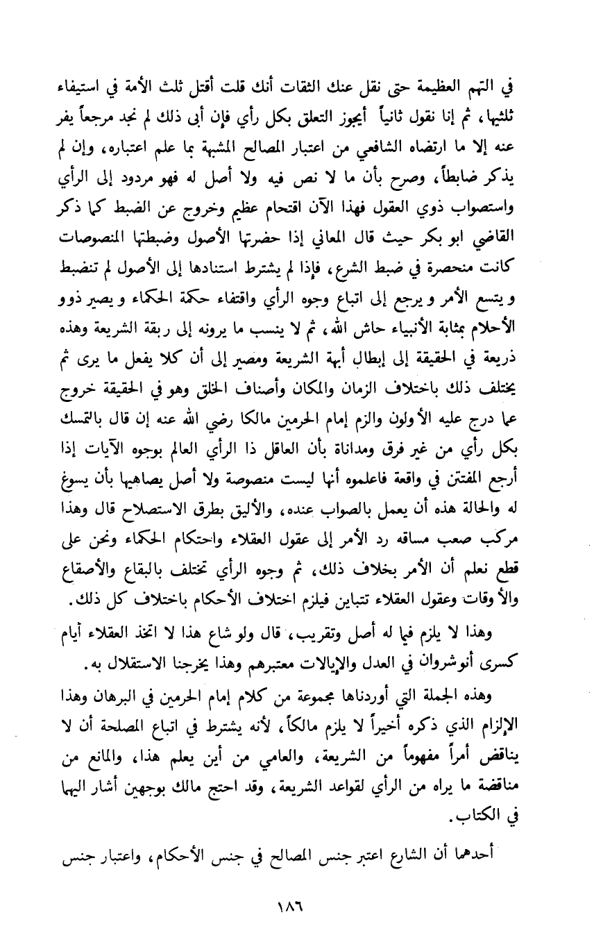 في التهم العظيمة حتى نقل عنك الثقات أنك قلت أقتل ثلث الأمة في استيفاء ثلثيها ثم إنا نقول ثانيا أيجوز التعلق بكل رأي فإن أبى ذلك لم نجد مرجعا يفر عنه إلا ما ارتضاه الشافعي من اعتبار المصالح المشبه بما علم اعتباره وإن لم يذكر ضابطا وصرح بأن ما لا نص فيه ولا أصل له فهو مردود إلى الرأي واستصواب ذوي العقول فهذا الآن اقتحام عظيم وخروج عن الضبط كما ذكر القاضي أبو بكر حيث قال المعاني إذا حضرتها الأصول وضبطتها المنصوصات كانت منحصرة في ضبط الشرع فإذا لم يشترط استنادها إلى الأصول لم تنضبط ويتسع الأمر ويرجع إلى اتباع وجوه الرأي واقتفاء حكمة الحكماء ويصير ذوو الأحلام بمثابة الأنبياء حاش الله ثم لا ينسب ما يرونه إلى ربقة الشريعة وهذه ذريعة في الحقيقة إلى إبطال أبهة الشريعة ومصير إلى أن كلا يفعل ما يرى ثم يختلف ذلك باختلاف الزمان والمكان وأصناف الخلق وهو في الحقيقة خروج عما درج عليه الأولون والزم إمام الحرمين مالكا رضي الله عنه إن قال بالتمسك بكل رأي من غير فرق ومداناة بأن العاقل ذا الرأي العالم بوجوه الآيات إذا أرجع المفتتن في واقعة فاعلموه أنها ليست بمنصوصة ولا أصل يصاهيها بأن يسوغ له والحالة هذه أن يعمل بالصواب عنده والأليق بطرق الاستصلاح قال وهذا مركب صعب مساقه رد الأمر إلى عقول العقلاء واحتكام الحكماء ونحن على قطع نعلم أن الأمر بخلاف ذلك ثم وجوه الرأي تختلف بالبقاع والأصقاع والأوقات وعقول العقلاء تتباين فيلزم اختلاف الأحكام باختلاف كل ذلك