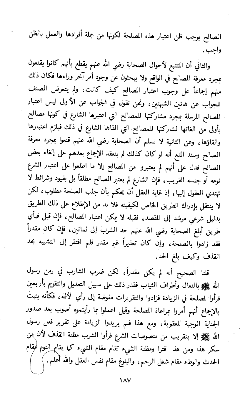 والثاني أن المتتبع لأحوال الصحابة رضي الله عنهم يقطع بأنهم كانوا يقنعون بمجرد معرفة المصالح في الواقع ولا يبحثون عن وجود أمر آخر وراءها فكان ذلك منهم إجماعا على وجوب اعتبار المصالح كيف كانت ولم يتعرض المصنف للجواب عن هاتين الشبهتين ونحن نقول في الجواب عن الأولى ليس اعتبار المصالح المرسلة بمجرد مشاركتها للمصالح التي اعتبرها الشارع في كونها مصالح بأولى من إلغائها لمشاركتها للمصالح التي ألقاها الشارع في ذلك فيلزم اعتبارها وإلقاؤها وعن الثانية لا نسلم أن الصحابة رضي الله عنهم قنعوا بمجرد معرفة المصالح وسند المنع أنه لو كان كذلك لم ينعقد الإجماع بعدهم على إلغاء بعض المصالح فدل على أنهم لم يعتبروا من المصالح إلا ما اطلعوا على اعتبار الشرع نوعه أو جنسه القريب فإن الشارع لم يعتبر المصالح مطلقا بل بقيود وشرائط لا تهتدي العقول إليها إذ غاية العقل أن يحكم بأن جلب المصلحة مطلوب لكن لا ينتقل بإدراك الطريق الخاص لكيفيته فلا بد من الإطلاع على ذلك الطريق بدليل شرعي مرشد إلى المقصد فقبله لا يمكن اعتبار المصالح فإن قيل فبأي طريق أبلغ الصحابة رضي الله عنهم حد الشرب إلى ثمانين فإن كان مقدرا فقد زادوا بالمصلحة وإن كان تعذيرا غير مقدر فلم افتقر إلى التشبيه بحد القذف وكيف بلغ الحد