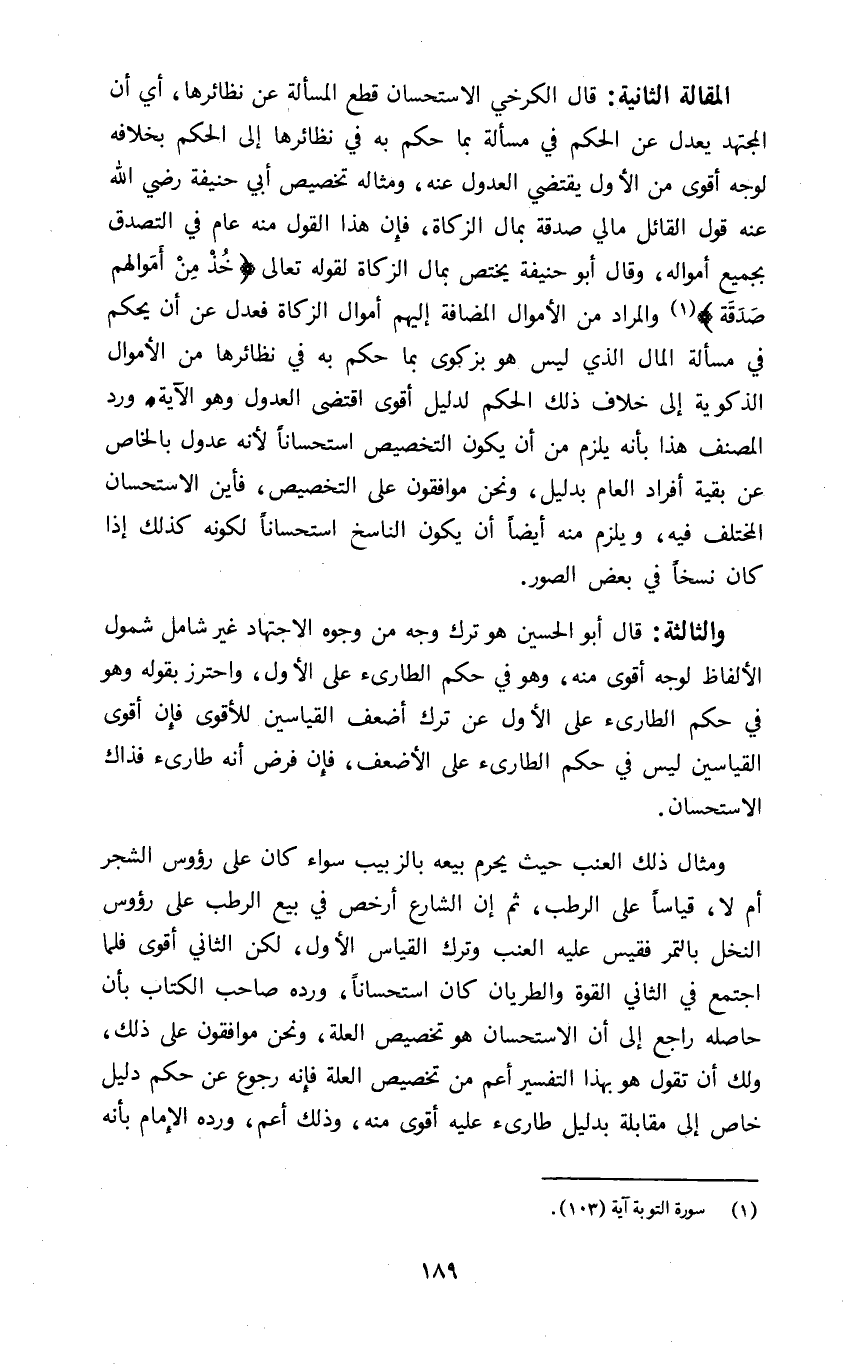 المقالة الثانية قال الكرخي الاستحسان قطع المسألة عن نظائرها أي أن المجتهد يعدل عن الحكم في مسألة بما حكم به في نظائرها إلى الحكم بخلافه لوجه أقوى من الأول يقتضي العدول عنه ومثاله تخصيص أبي حنيفة رضي الله عنه قول القائل مالي صدقة بمال الزكاة فإن هذا القول منه عام في التصدق بجميع أمواله وقال أبو حنيفة يختص بمال الزكاة لقوله تعالى: {خُذْ مِنْ أَمْوَالِهِمْ صَدَقَةً١} والمراد من الأموال المضافة إليهم أموال الزكاة فعدل عن أن يحكم في مسألة المال الذي ليس هو بزكوى بما حكم به في نظائرها من الأموال الزكوية إلى خلاف ذلك الحكم لدليل أقوى اقتضى العدول وهو الآية ورد المصنف هذا بأنه يلزم من أن يكون التخصيص استحسانا لأنه عدول بالخاص عن بقية أفراد العام بدليل ونحن موافقون على التخصيص فأين الاستحسان المختلف فيه ويلزم منه أيضا أن يكون الناسخ استحسانا لكونه كذلك إذا كان نسخا في بعض الصور