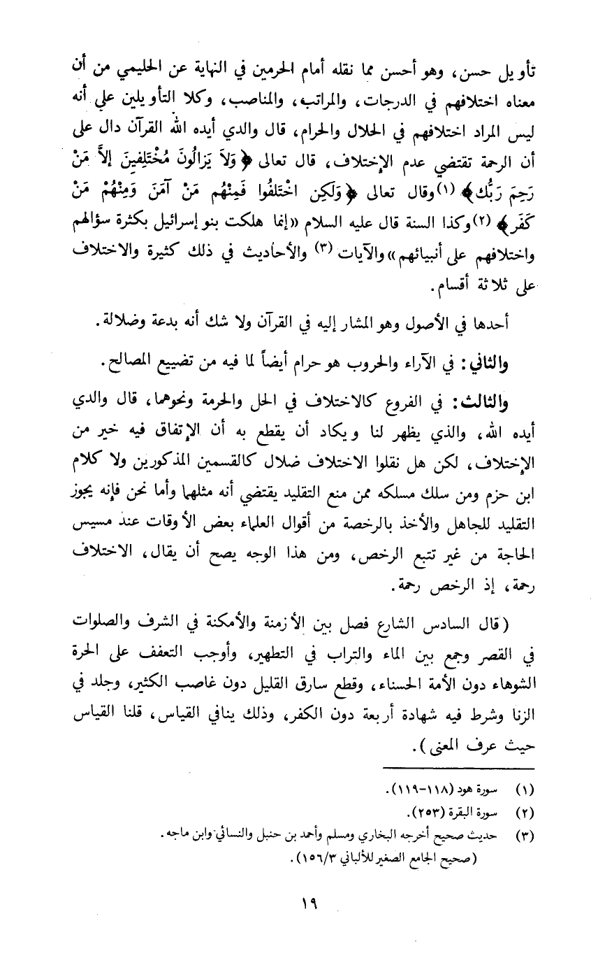 تأويل حسن وهو أحسن مما نقله إمام الحرمين في النهاية عن الحليمي من أن معناه اختلافهم في الدرجات والمراتب والمناصب وكلا التأويلين على أنه ليس المراد اختلافهم في الحلال والحرام قال والدي أيده الله القرآن دال على أن الرحمة تقتضي عدم الاختلاف قال تعالى: {وَلا يَزَالُونَ مُخْتَلِفِينَ إِلَّا مَنْ رَحِمَ رَبُّكَ١} وقال تعالى: {وَلَكِنِ اخْتَلَفُوا فَمِنْهُمْ مَنْ آمَنَ وَمِنْهُمْ مَنْ كَفَرَ٢} وكذا السنة قال عليه السلام:"إنما هلكت بنو إسرائيل بكثرة سؤالهم واختلافهم على أنبيائهم٣" والآيات والأحاديث في ذلك كثيرة والاختلاف على ثلاثة أقسام