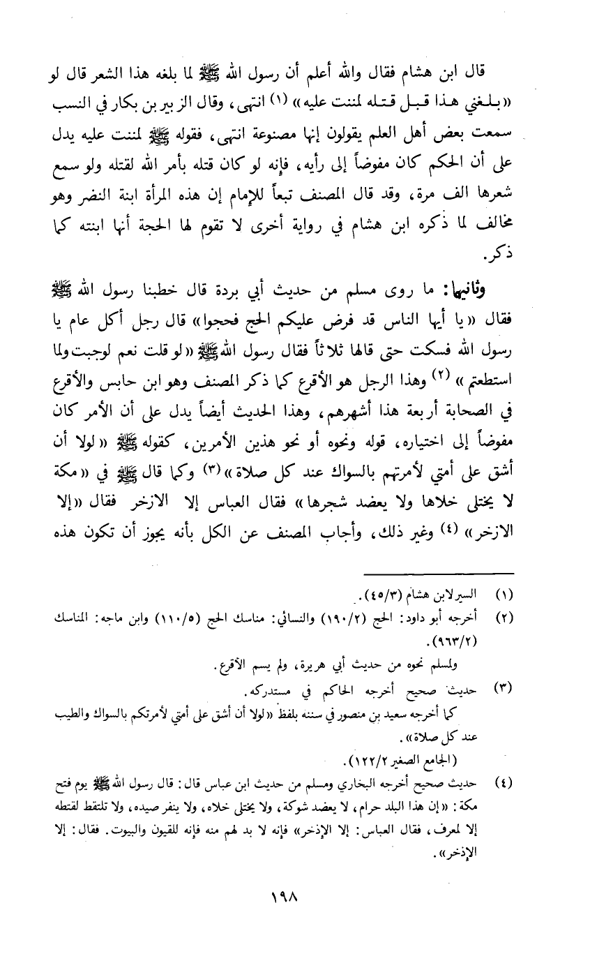 وثانيهما ما روى مسلم من حديث أبي بردة قال خطبنا رسول الله صلى الله عليه وسلم فقال: "يا أيها الناس قد فرض عليكم الحج فحجوا" قال رجل أكل عام يا رسول الله فسكت حتى قالها ثلاثا فقال رسول الله صلى الله عليه وسلم: "لو قلت نعم لوجبت ولما استطعتم٢" وهذا الرجل هو الأقرع كما ذكر المصنف وهو ابن حابس والأقرع في الصحابة أربعة هذا أشهرهم وهذا الحديث أيضا يدل على أن الأمر كان مفوضا إلى اختياره قوله ونحوه أو نحو هذين الأمرين كقوله صلى الله عليه وسلم: "لولا أن أشق على أمتي لأمرتهم بالسواك عند كل صلاة٣" وكما قال صلى الله عليه وسلم: "في مكة لا يختلى خلاها ولا يعضدها شجرها" فقال العباس إلا الأزخر فقال: "إلا الازخر٤" وغير ذلك وأجاب المصنف عن الكل بأنه يجوز أن تكون هذه