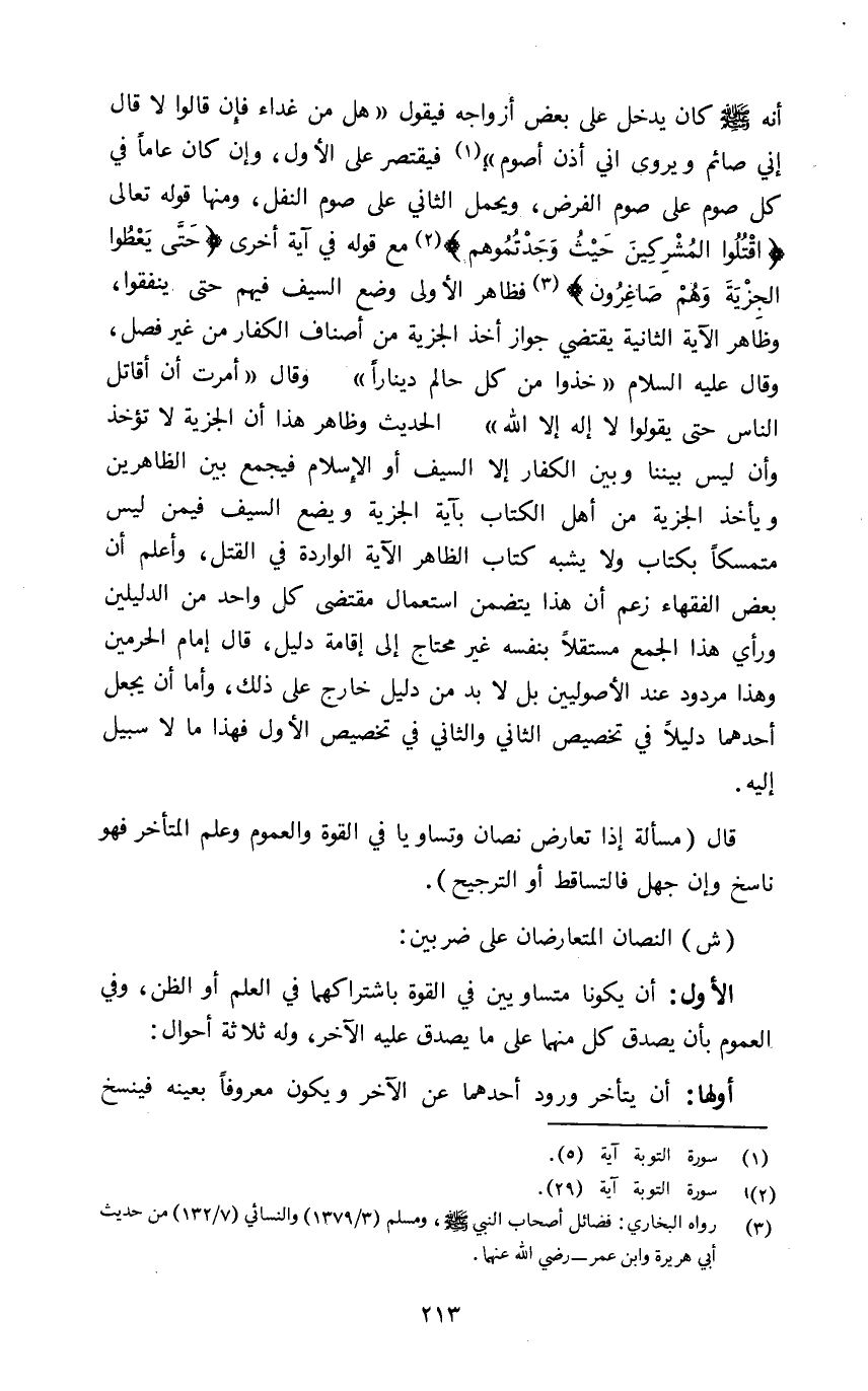 {حَتَّى يُعْطُوا الْجِزْيَةَ عَنْ يَدٍ وَهُمْ صَاغِرُونَ٣} فظاهر الأولى وضع السيف فيهم حتى ينفقوا وظاهر الآية الثانية يقتضي جواز أخذ الجزية من أصناف الكفار من غير فصل وقال عليه السلام: "خذوا من كل حالم دينارا" وقال: "أمرت أن أقاتل الناس حتى يقولوا لا إله إلا الله" الحديث وظاهر هذا أن الجزية لا تؤخذ وأن ليس بيننا وبين الكفار إلا السيف أو الإسلام فيجمع بين الظاهرين ويأخذ الجزية من أهل الكتاب بآية الجزية ويضع السيف فيمن ليس متمسكا بكتاب ولا يشبه كتاب الظاهر الآية الواردة في القتل وأعلم أن بعض الفقهاء زعم أن هذا يتضمن استعمال مقتضى كل واحد من الدليلين ورأى هذا الجمع مستقلا بنفسه غير محتاج إلى إقامة دليل قال إمام الحرمين وهذا مردود عند الأصوليين بل لا بد من دليل خارج على ذلك وأما أن يجعل أحدهما دليلا في تخصيص الثاني والثاني في تخصيص الأول فهذا ما لا سبيل إليه