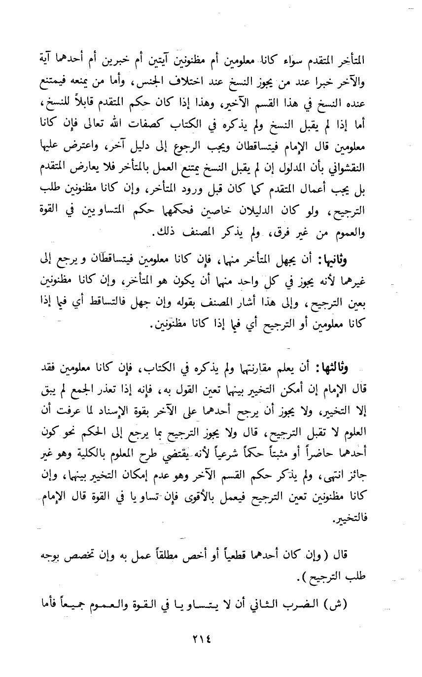 المتأخر المتقدم سواء كانا معلومين أو مظنونين آيتين أم خبرين أم أحدهما آية والآخر خبرا عند من يجوز النسخ عند اختلاف الجنس وأما من يمنعه فيمتنع عنده النسخ في هذا القسم الآخير وهذا إذا كان حكم المتقدم قابلا للنسخ أما إذا لم يقبل النسخ ولم يذكره في الكتاب كصفات الله تعالى فإن كانا معلومين قال الإمام فيتساقطان ويجب الرجوع إلى دليل آخر واعترض عليها النقشواني بأن المدلول إن لم يقبل النسخ يمتنع العمل بالمتأخر فلا يعارض المتقدم بل يجب أعمال المتقدم كما كان قبل ورود المتأخر وإن كانا مظنونين طلب الترجيح ولو كان الدليلين خاصين فحكمهما حكم المتساويين في القوة والعموم من غير فرق ولم يذكر المصنف ذلك