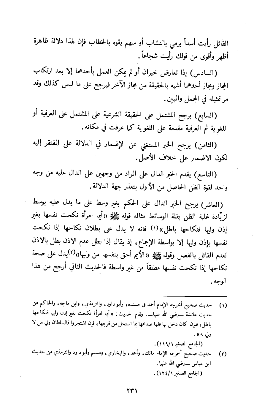 العاشر: يرجح الخبر الدال على الحكم بغير وسط على ما يدل عليه بوسط لزيادة غلبة الظن بقلة الوسائط مثاله قوله صلى الله عليه وسلم: "أيما امرأة نكحت نفسها بغير إذن وليها فنكاحها باطل١" فإنه لا يدل على بطلان نكاحها إذا نكحت نفسها بإذن وليها إلا بواسطة الإجماع إذ يقال إذا بطل عدم الإذن بطل بالإذن لعدم القائم بالفصل وقوله صلى الله عليه وسلم: "الأيم أحق بنفسها من وليها٢" يدل على صحة نكاحها إذا نكحت نفسها مطلقا من غير واسطة فالحديث الثاني أرجح من هذا الوجه