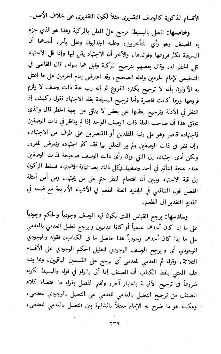 وخامسها: المعلل بالبسيطة مرجح على المعلل بالمركبة وهذا هو الذي جزم به المصنف وهو رأي المتأخرين وعليه الجدليون وعلل بأمر أحدهما أن البسيطة تكثر فروعها فوائدها والآخر أن الاجتهاد يقل فيها وإذا قل الاجتهاد قل الحظر له وقال بعضهم بترجيح المركبة وقيل هما سواء قال القاضي في التلخيص لإمام الحرمين ولعله الصحيح وقد اعترض إمام الحرمين على ما اعتل به الأولون بأنه لا ترجيح بكثرة الفروع ثم إنه رب علة ذات وصف لا يلزم فروعها وربما كانت قاصرة وأما ترجيح البسيطة بقلة الاجتهاد فقول ركيك إذ النظر في الأدلة وترجيح بعضها على بعض لا يتلقى من جهة الحظر قال والذي يحقق هذا أن صاحب العلة ذات الوصف الواحد إذا لم يناظر في ذات الوصفين فاجتهاده قاصر وهو على رتبة المقلدين أو المقتصرين على طرف من الاجتهاد وإن نظر في ذات الوصفين ولم ير التعلق بهما فقد كثر اجتهاده وتعرض للغرور ولكن أدى اجتهاده إلى النفي وإن رأى ذات الوصف صحيحة فذات الوصفين عنده عديمة التأثير في أحد وصفيها وكل ذلك بعد نهاية الاجتهاد فسقط الركون إلى قلة الاجتهاد وتبين أن اقتحام النظر حتم على من يجتهد ومن أمن أمثلة الفصل قول الشافعي في الجديد العلة الطعم في الأشياء الأربعة مع ضمه في القديم التقدير إلى الطعم