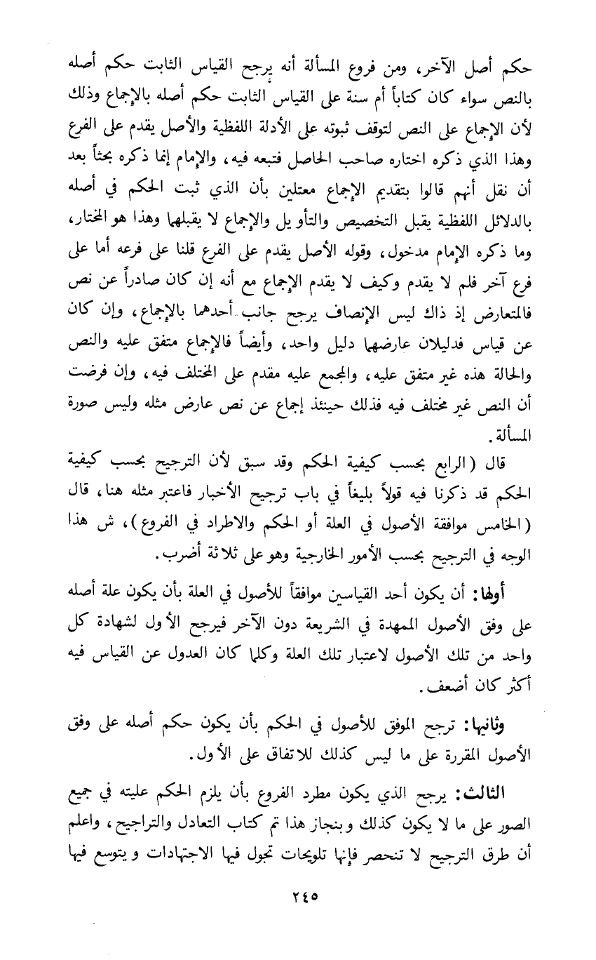 الثالث: يرجح الذي يكون مطرد الفروع بأن يلزم الحكم عليته في جميع الصور على ما لا يكون كذلك وبنجاز هذا تم كتاب التعادل والترجيح واعلم أن طرق الترجيح لا تنحصر فإنها تلويحات تجول فيها الاجتهادات ويتوسع فيها