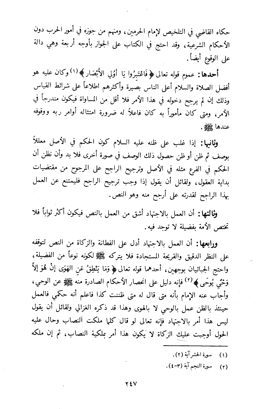 ورابعها:أن العمل بالاجتهاد أدل على الفطانة والزكاة من النص لتوقفه على النظر الدقيق والقريحة المستجادة فلا يتركه صلى الله عليه وسلم لكونه نوعا من الفضيلة واحتج الجبائيان بوجهين أحدهما قوله تعالى: {وَمَا يَنْطِقُ عَنِ الْهَوَى إِنْ هُوَ إِلَّا وَحْيٌ يُوحَى٢} فإنه دليل على انحصار الأحكام الصادرة منه صلى الله عليه وسلم عن الوحي وأجاب عنه الإمام بأنه متى قال له متى ظننت كذا فاعلم أنه حكمي فالعمل حينئذ بالظن عمل بالوحي لا بالهوى وهذا قد ذكره الغزالي ولقائل أن يقول ليس هذا أمر بالاجتهاد فإنه تعالى لو قال كلما ملكت النصاب وحال عليه الحول أوجبت عليك الزكاة لا يكون هذا أمر بملكية النصاب ثم إن ملكه