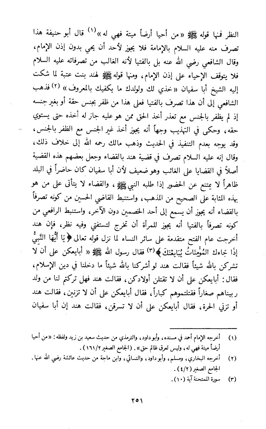 النظر فمنها قوله صلى الله عليه وسلم: "من أحيا أرضا ميتة فهي له١" قال أبو حنيفة هذا تصرف منه عليه السلام بالإمامة فلا يجوز لأحد أن يحي بدون إذن الإمام وقال الشافعي رضي الله عنه بل بالفتيا لأنه الغالب من تصرفاته عليه السلام فلا يتوقف الإحياء على إذن الإمام ومنها قوله صلى الله عليه وسلم لهند بنت عتبة لما شكت إليه الشيخ أبا سفيان: "خذي لك ولولدك ما يكفيك بالمعروف٢" فذهب الشافعي إلى أن هذا تصرف بالفتيا فعلى هذا من ظفر بجنس حقه أو بغير جنسه إذ لم يظفر بالجنس مع تعذر أخذ الحق ممن هو عليه جاز له أخذه حتى يستوي حقه وحكى في التهذيب وجها أنه يجوز أخذ غير الجنس مع الظفر بالجنس وقد يوجه بعدم التنفيذ في الحديث وذهب مالك رحمه الله إلى خلاف ذلك وقال إنه عليه السلام تصرف في قضية هند بالقضاء وجعل بعضهم هذه القضية أصلا في القضايا على الغائب وهو ضعيف لأن أبا سفيان كان حاضرا في البلد ظاهرا لا يمتنع عن الحضور إذا طلبه النبي صلى الله عليه وسلم والقضاء لا يتأتى على من هو بهذه المثابة على الصحيح من المذهب واستنبط القاضي الحسين من كونه تصرفا بالقضاء أنه يجوز أن يسمع إلى أحد الخصمين دون الآخر واستنبط الرافعي من كونه تصرفا بالفتيا أنه يجوز للمرأة أن تخرج لتستفتي وفيه نظر فإن هند أخرجت عام الفتح متقدمة على سائر النساء لما نزل قوله تعالى: {يَا أَيُّهَا النَّبِيُّ إِذَا جَاءَكَ الْمُؤْمِنَاتُ يُبَايِعْنَكَ٣} فقال رسول الله صلى الله عليه وسلم: "أبايعنكن على أن لا تشركن بالله شيئا" فقالت هند لو أشركنا بالله شيئا ما دخلنا في دين الإسلام فقال: "أبايعكن على أن لا تقتلن أولادكن" فقالت هند فهل تركتم لنا من ولد ربيناهم صغارا فقتلتموهم كبارا فقال: "أبايعكن على أن لا تزنين" فقالت هند أو تزني الحرة فقال: "أبايعكن على أن لا تسرقن" فقالت هند إن أبا سفيان