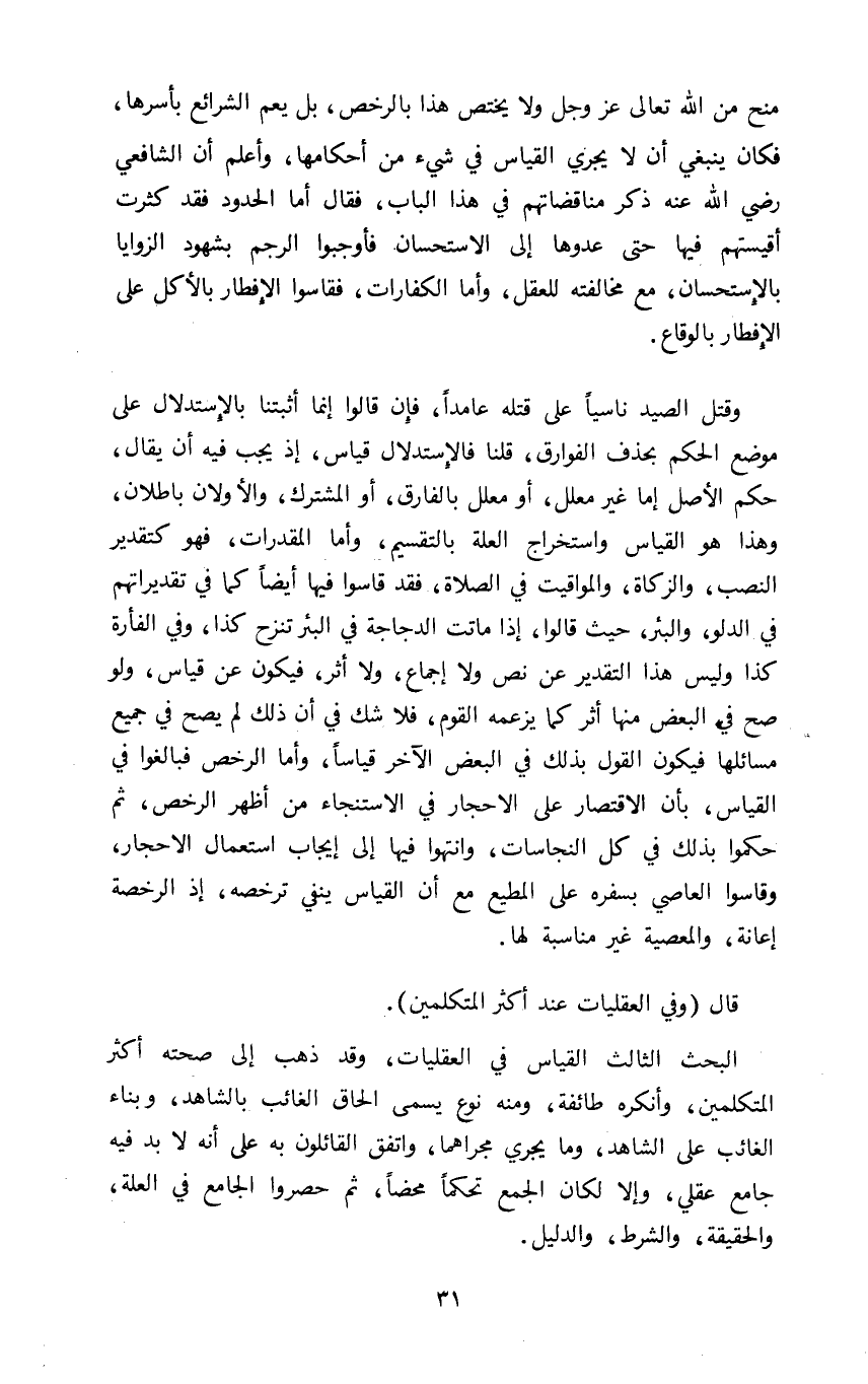 وقتل الصيد ناسيا على قتله عامدا فإن قالوا إنما أثبتنا بالاستدلال على موضع الحكم بحذف الفوارق قلنا فالاستدلال قياس إذ يجب فيه أن يقال حكم الأصل إما غير معلل أو معلل بالفارق أو المشترك والأولان باطلان وهذا هو القياس واستخراج العلة بالتقسيم وأما المقدرات فهو كتقدير النصب والزكاة والمواقيت في الصلاة فقد قاسوا فيها أيضا كما في تقديراتهم في الدلو والبئر حيث قالوا إذا ماتت الدجاجة في البئر تنزح كذا وفي الفأرة كذا وليس هذا التقدير عن نص ولا إجماع ولا أثر فيكون عن قياس ولو صح في البعض منها أثر كما يزعمه القوم فلا شك في أن ذلك لم يصح في جميع مسائلها فيكون القول بذلك في البعض الآخر قياسا وأما الرخص فبالغوا في القياس بأن الاقتصار على الأحجار في الاستنجاء من أظهر الرخص ثم حكموا بذلك في كل النجاسات وانتهوا فيها إلى إيجاب استعمال الأحجار وقاسوا العاصي بسفره على المطيع مع أن القياس ينفي ترخصه إذ الرخصة إعانة والمعصية غير مناسبة لها