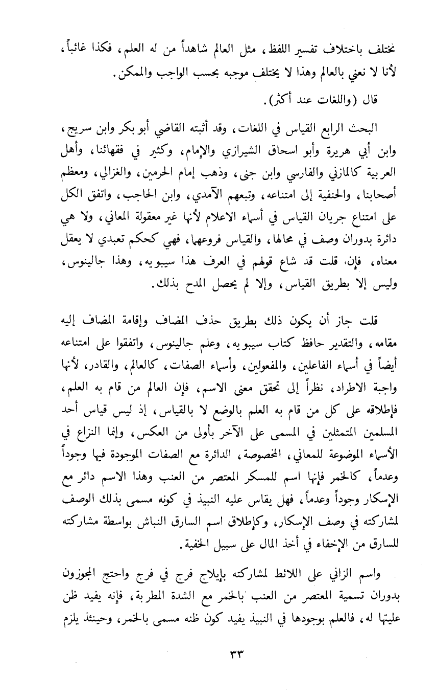 قلت جاز أن يكون ذلك بطريق حذف المضاف وإقامة المضاف إليه مقامه والتقدير حافظ الكتاب سيبويه وعلم جالينوس واتفقوا على امتناعه أيضا في أسماء الفاعلين والمفعولين وأسماء الصفات كالعالم والقادر لأنها واجبة الاطراد نظرا إلى تحقق معنى الاسم فإن العالم من قام به العلم فإطلاقه على كل من قام به العلم بالوضع لا بالقياس إذ ليس قياس أحد المسلمين المتمثلين في المسمى على الآخر بأولى من العكس وإنما النزاع في الأسماء الموضوعة للمعاني المخصوصة الدائرة مع الصفات الموجودة فيها وجودا وعدما كالخمر فإنه اسم للمسكر المعتصر من العنب وهذا الاسم دائر مع الإسكار وجودا وعدما فهل يقاس عليه النبيذ في كونه مسمى بذلك الوصف لمشاركته في وصف الإسكار وكإطلاق اسم السارق النباش بواسطة مشاركته للسارق من الإخفاء في أخذا المال على سبيل الخفية