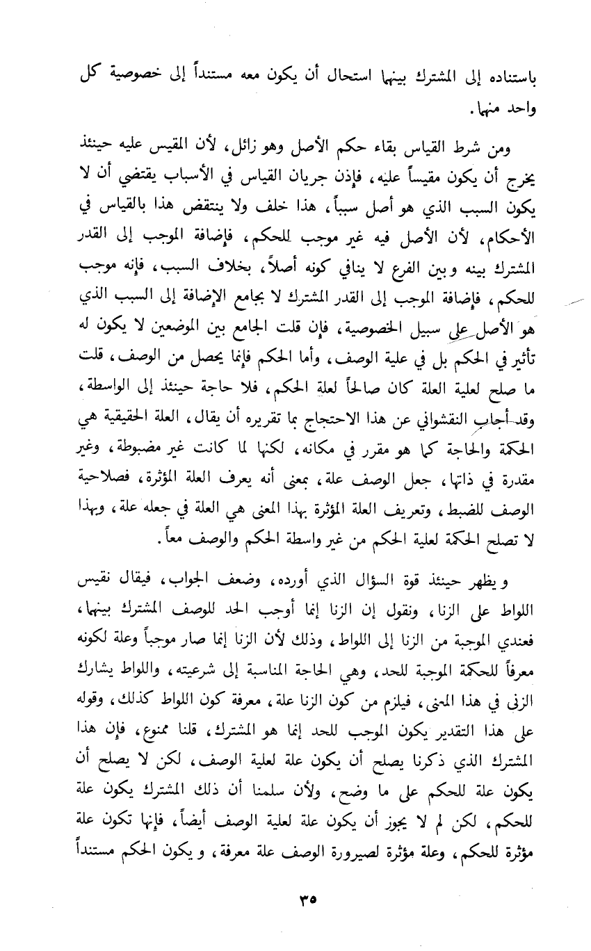 ومن شرط القياس بقاء حكم الأصل وهو زائل لأن المقيس عليه حينئذ يخرج أن يكون مقيسا عليه فإذن جريان القياس في الأسباب يقتضي أن لا يكون السبب الذي هو أصل سببا هذا خلف ولا ينتقض هذا بالقياس في الأحكام لأن الأصل فيه غير موجب للحكم فإضافة الموجب إلى القدر المشترك بينه وبين الفرع لا ينافي كونه أصلا بخلاف السبب فإنه موجب للحكم فإضافة الموجب إلى القدر المشترك لا يجامع الإضافة إلى السبب الذي هو الأصل على سبيل الخصوصية فإن قلت الجامع بين الموضعين لا يكون له تأثير في الحكم بل في علية الوصف وأما الحكم فإنما يحصل من الوصف قلت ما صلح لعلية العلة كان صالحا لعلة الحكم فلا حاجة حينئذ إلى الواسطة وقد أجاب النقشواني عن هذا الاحتجاج بما تقريره أن يقال العلة الحقيقية هي الحكمة والحاجة كما هو مقرر في مكانه لكنها لما كانت غير مضبوطة وغير مقدرة في ذاتها جعل الوصف علة بمعنى أنه يعرف العلة المؤثرة فصلاحية الوصف للضبط وتعريف العلة المؤثرة بهذا المعنى هي العلة في جعله علة وبهذا لا تصلح الحكمة لعلية الحكم من غير واسطة الحكم والوصف معا