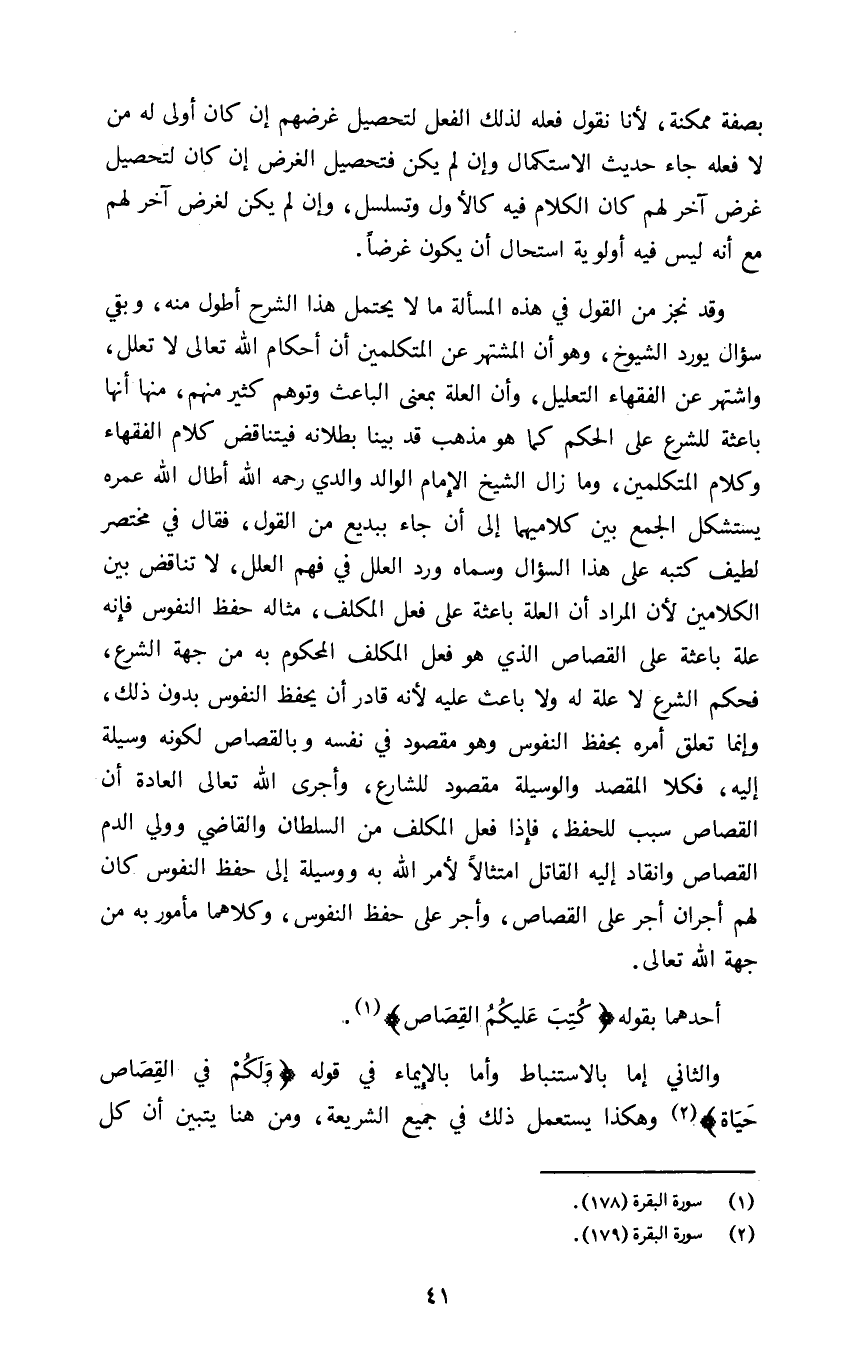 والثاني إما بالاستنباط وأما بالإيماء في قوله: {وَلَكُمْ فِي الْقِصَاصِ حَيَاةٌ٢} وهكذا يستعمل ذلك في جميع الشريعة ومن هنا يتبين أن كل