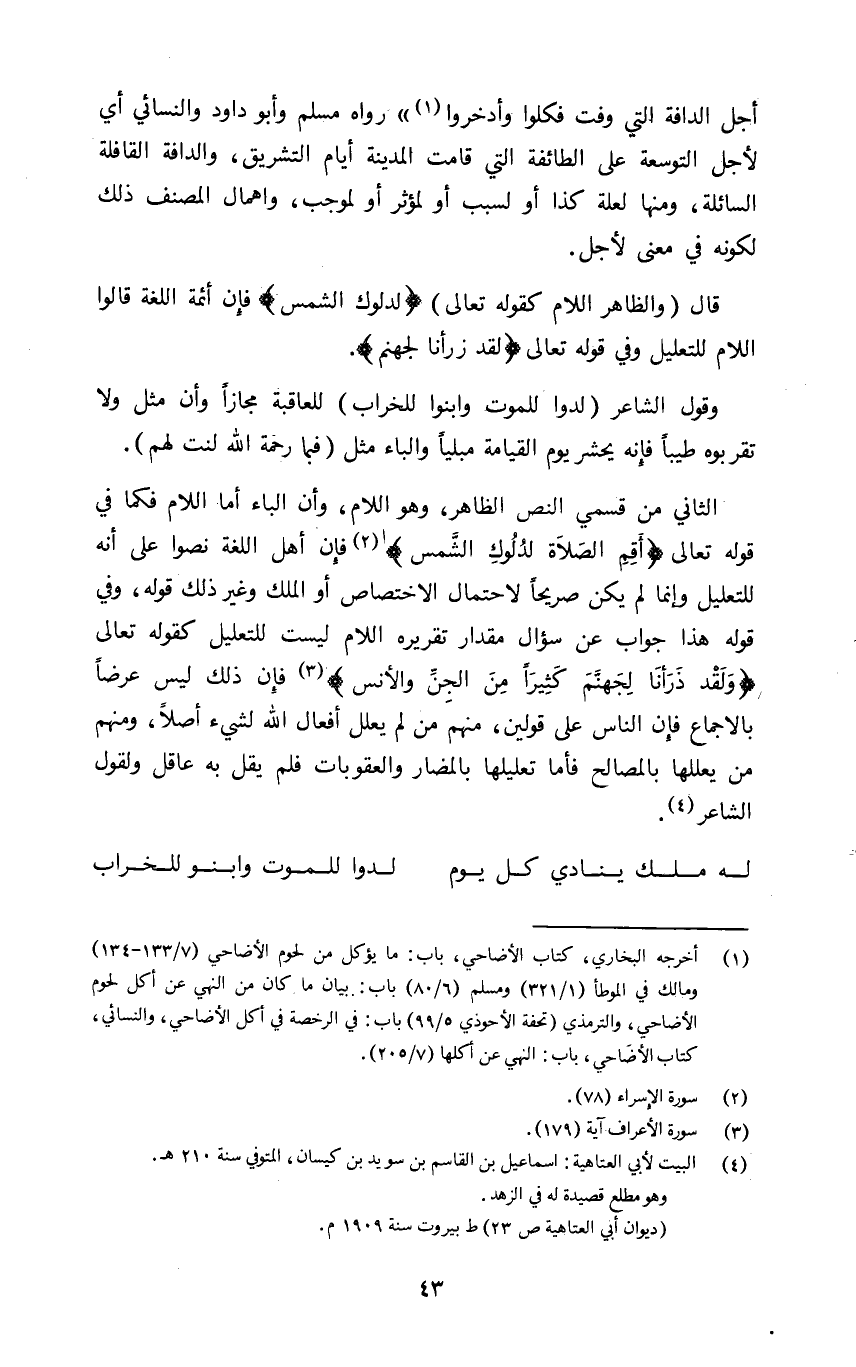 الثاني من قسمي النص الظاهر وهو اللام وأن الباء أما اللام فكما في قوله تعالى: {أَقِمِ الصَّلاةَ لِدُلُوكِ الشَّمْسِ٢} فإن أهل اللغة نصوا على أنه للتعليل وإنما لم يكن صريحا لاحتمال الاختصاص أو الملك وغير ذلك قوله وفي قوله هذا جواب عن سؤال مقدار تقريره اللام ليست للتعليل كقوله تعالى: {لَقَدْ ذَرَأْنَا لِجَهَنَّمَ كَثِيراً مِنَ الْجِنِّ وَالْأِنْسِ٣} فإن ذلك ليس عرضا بالإجماع فإن الناس على قولين منهم من لم يعلل أفعال الله لشيء أصلا ومنهم من يعللها بالمصالح فأما تعليلها بالمضار والعقوبات فلم يقل به عاقل ولقول الشاعر ٤