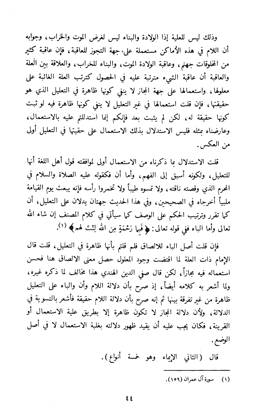 وذلك ليس للعلية إذا الولادة والبناء ليس لغرض الموت والخراب وجوابه أن اللام في هذه الأماكن مستعملة على جهة التجوز للعاقبة فإن عاقبة كثير من المخلوقات جهنم وعاقبة الولادة الموت والبناء للخراب والعلاقة بين العلة والعاقبة أن عاقبة الشيء مترتبة عليه في الحصول كترتب العلة الغائبة على معلولها واستعمالها على جهة المجاز لا ينفي كونها ظاهرة في التعليل الذي هو حقيقتها فإن قلت استعمالها في غير التعليل لا ينفي كونها ظاهرة فيه لو ثبت كونها حقيقة له لكن لم يثبت بعد فإنكم إنما استدللتم عليه بالاستعمال وعارضناه بمثله فليس الاستدلال بذلك الاستعمال على حقيتها في التعليل أولى من العكس