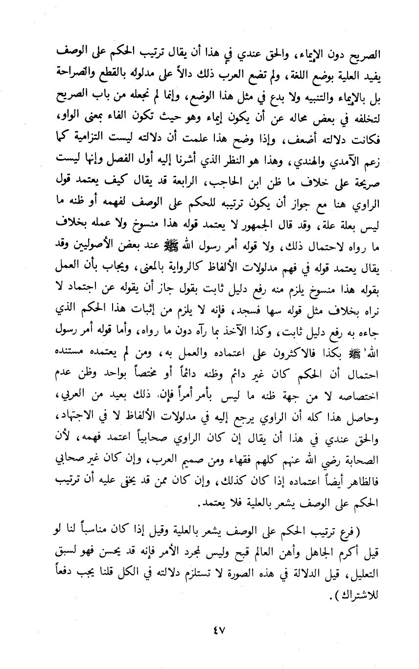 الصريح دون الإيماء والحق عندي في هذا أن يقال ترتيب الحكم على الوصف يفيد العلية بوضع اللغة ولم تضع العرب ذلك دالا على مدلوله بالقطع والصراحة بل بالإيماء والتنبيه ولا بدع في مثل هذا الوضع وإنما لم نجعله من باب الصريح لتخلفه في بعض محاله عن أن يكون إيماء وهو حيث تكون الفاء بمعنى الواو فكانت دلالته أضعف وإذا وضح هذا علمت أن دلالته ليست إلتزامية كما زعم الآمدي والهندي وهذا هو النظر الذي أشرنا إليه أول الفصل وإنها ليست صريحة على خلاف ما ظن ابن الحاجب الرابعة قد يقال كيف يعتمد قول الراوي هنا مع جواز أن يكون ترتيبه للحكم على الوصف لفهمه أو ظنه ما ليس بعلة علة وقد قال الجمهور لا يعتمد قوله هذا منسوخ ولا عمله بخلاف ما رواه لاحتمال ذلك ولا قوله أمر رسول الله صلى الله عليه وسلم عند بعض الأصوليين وقد يقال يعتمد قوله في فهم مدلولات الألفاظ كالرواية بالمعنى ويجاب بأن العمل بقوله هذا منسوخ يلزم منه رفع دليل ثابت بقول جاز أن يقوله عن اجتماد لا نراه بخلاف مثل قوله سها فسجد فإنه لا يلزم من إثبات هذا الحكم الذي جاءه به رفع دليل ثابت وكذا الآخذ بما رآه دون ما رواه وأما قوله أمر رسول الله صلى الله عليه وسلم بكذا فالأكثرون على اعتماده والعمل به ومن لم يعتمده مستنده احتمال أن الحكم كان غير دائم وظنه دائما أو مختصا بواحد وظن عدم اختصاصه لا من جهة ظنه ما ليس بأمر أمرا فإن ذلك بعيد من العربي وحاصل هذا كله أن الراوي يرجع إليه في مدلولات الألفاظ لا في الاجتهاد والحق عندي في هذا أن يقال إن كان الراوي صحابيا اعتمد فهمه لأن الصحابة رضي الله عنهم كلهم فقهاء ومن صميم العرب وإن كان غير صحابي فالظاهر أيضا اعتماده إذا كان كذلك وإن كان ممن قد يخفى عليه أن ترتيب الحكم على الوصف يشعر بالعلية فلا يعتمد