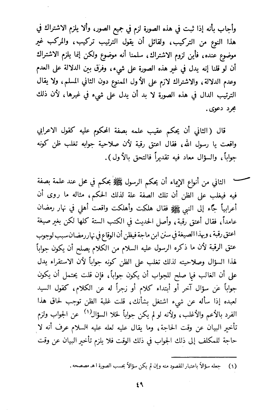 الثاني من أنواع الإيماء أن يحكم الرسول صلى الله عليه وسلم بحكم في محل عند علمه بصفة فيه فيغلب على الظن أن تلك الصفة علة لذلك الحكم مثاله ما روي أن أعرابيا جاء إلى النبي صلى الله عليه وسلم فقال هلكت وأهلكت واقعت أهلي في نهار رمضان عامدا فقال أعتق رقبة وأصل الحديث في الكتب الستة كلها لكن بغير صيغة أعتق رقبة وبهذا الصيغة في سنن ابن ماجة فيظن أن الوقاع في نهار رمضان سبب لوجوب عتق الرقبة لأن ما ذكره الرسول عليه السلام من الكلام يصلح أن يكون جوبا لهذا السؤال وصلاحيته لذلك تغلب على الظن كونه جوابا لأن الاستقراء يدل على أن الغالب فيما صلح للجواب أن يكون جوابا فإن قلت يحتمل أن يكون جوابا عن سؤال آخر أو ابتداء كلام أو زجرا له عن الكلام كقول السيد لعبده إذا سأله عن شيء اشتغل بشأنك قلت غلبة الظن توجب لحاق هذا الفرد بالأعم والأغلب ولأنه لو لم يكن جوابا لخلا السؤال١ عن الجواب ولزم تأخير البيان عن وقت الحاجة وما يقال عليه لعله عليه السلام عرف أنه لا حاجة للمكلف إلى ذلك الجواب في ذلك الوقت فلا يلزم تأخير البيان عن وقت
