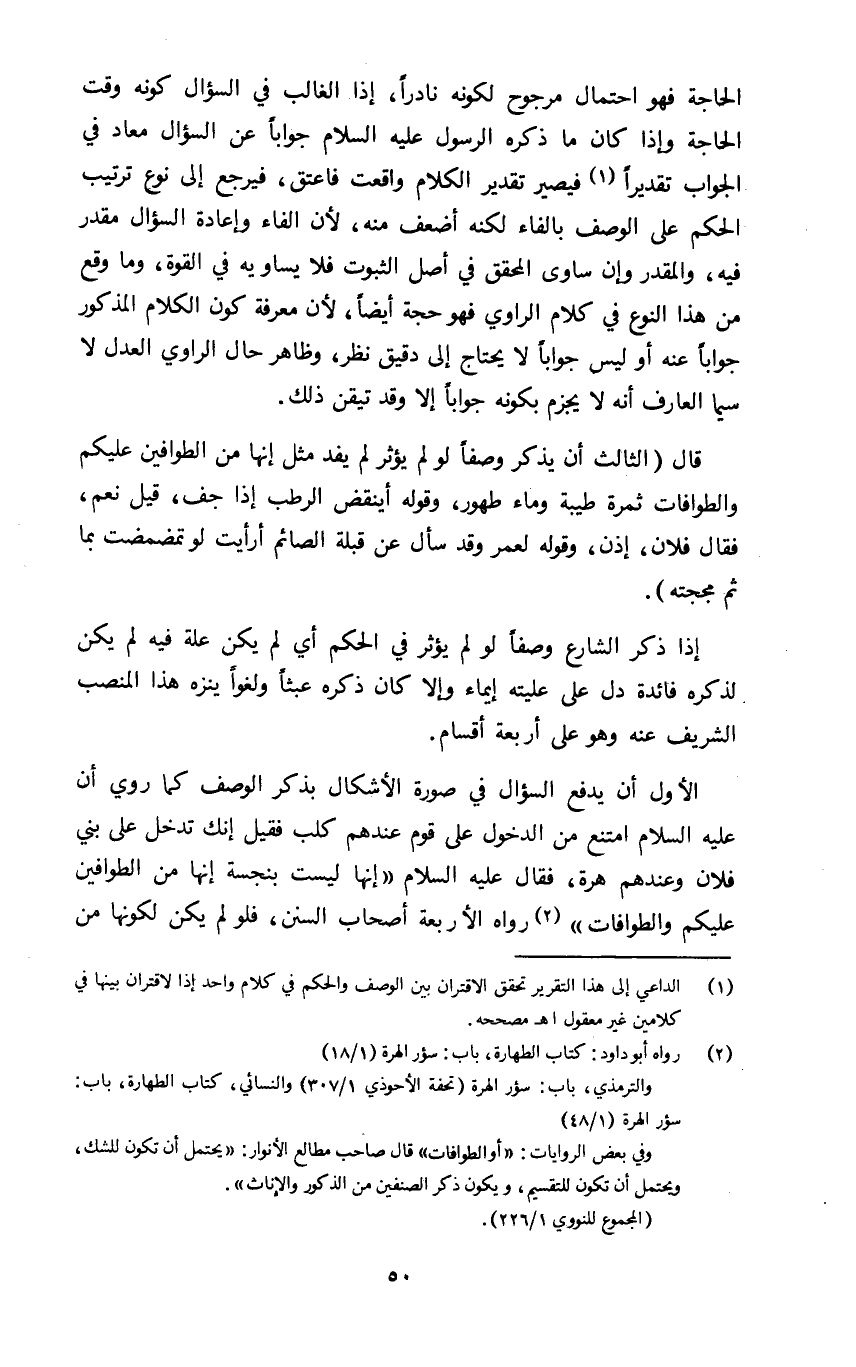 الأول أن يدفع السؤال في صورة الإشكال بذكر الوصف كما روي أن عليه السلام امتنع من الدخول على قوم عندهم كلب فقيل إنك تدخل على بني فلان وعندهم هرة فقال عليه السلام: "إنها ليست بنجسة إنها من الطوافين عليكم والطوافات٢" رواه الأربعة أصحاب السنن فلو لم يكن لكونها من