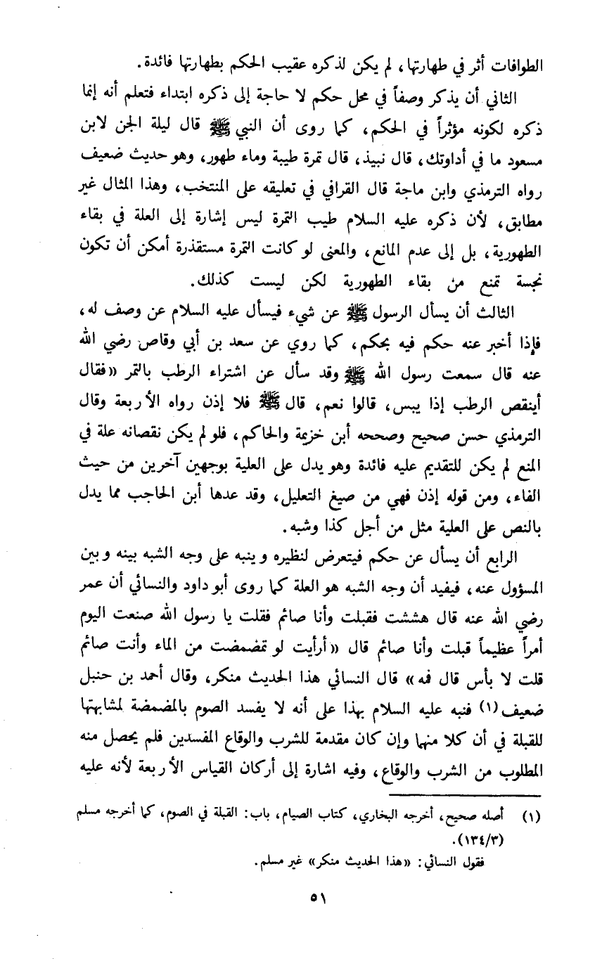 الرابع أن يسأل عن حكم فيتعرض لنظيره وينبه على وجه الشبه بينه وبين المسؤول عنه فيفيد أن وجه الشبه هو العلة كما روى أبو داود والنسائي أن عمر رضي الله عنه قال هششت فقبلت وأنا صائم فقلت يا رسول الله صنعت اليوم أمرا عظيما قبلت وأنا صائم قال: "أرأيت لو تمضمضت من الماء وأنت صائم" قلت لا بأس قال: "فمه" قال النسائي هذا الحديث منكر وقال أحمد بن حنبل ضعيف١ فنبه عليه السلام بهذا على أنه لا يفسد الصوم بالمضمضة لمشابهتها للقبلة في أن كلا منهما وإن كان مقدمة للشرب والوقاع المفسدين فلم يحصل منه المطلوب من الشرب والوقاع وفيه إشارة إلى أركان القياس الأربعة لأنه عليه