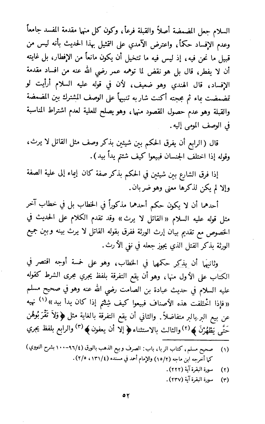 وثانيهما أن يذكر حكمهما في الخطاب وهو على خمسة أوجه اقتصر في الكتاب على الأول منها وهو أن يقع التفرقة بلفظ يجري مجرى الشرط كقوله عليه السلام في حديث عبادة بن الصامت رضي الله عنه وهو في صحيح مسلم "فإذا اختلفت هذه الأصناف فبيعوا كيف شئتم إذا كان يدا بيد١" نهيه عن بيع البر بالبر متفاضلا والثاني أن يقع التفرقة بالغاية مثل {وَلا تَقْرَبُوهُنَّ حَتَّى يَطْهُرْنَ٢} والثالث بالاستثناء {إِلَّا أَنْ يَعْفُونَ٣} والرابع بلفظ يجري