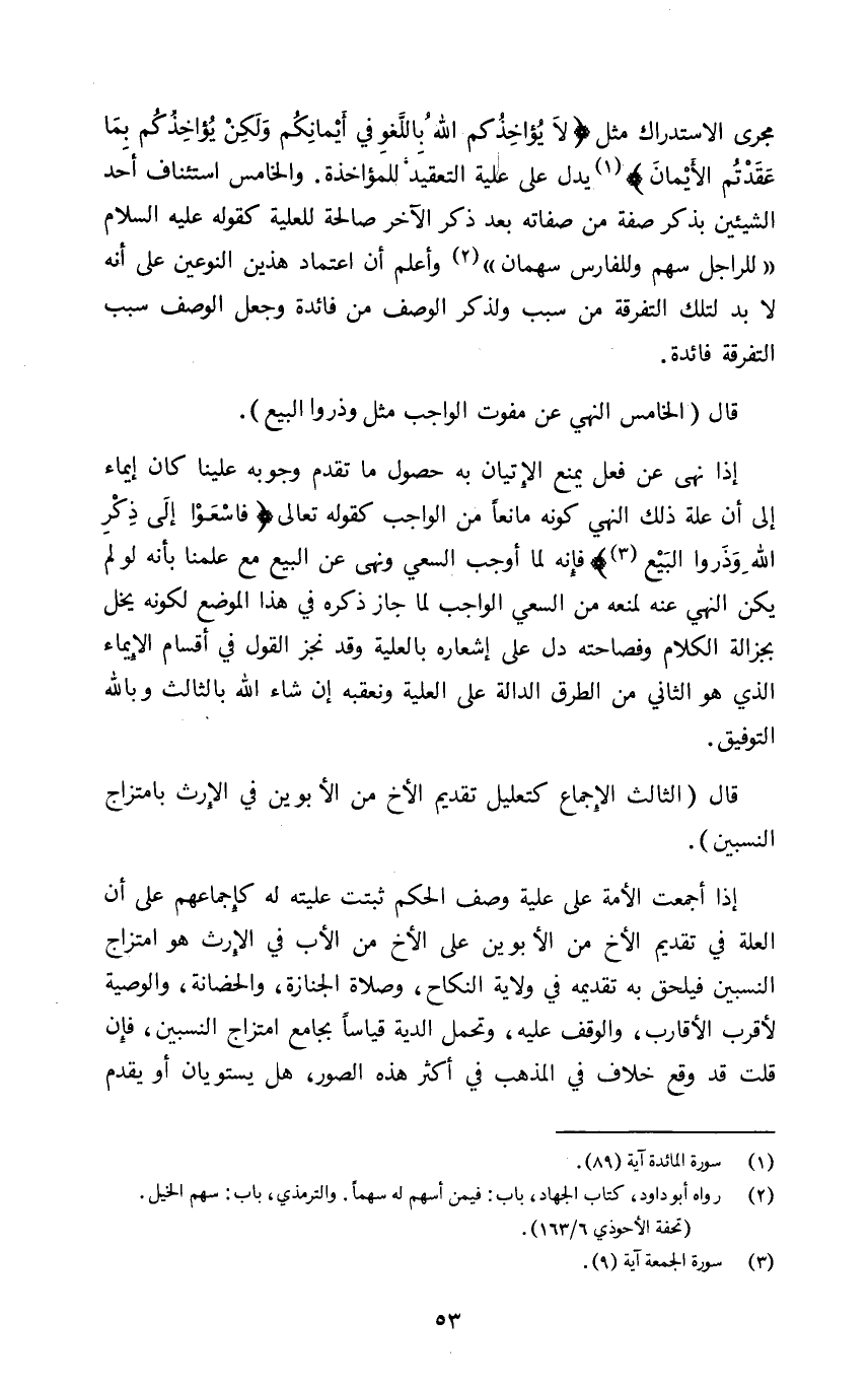 مجرى الاستدراك مثل {لا يُؤَاخِذُكُمُ اللَّهُ بِاللَّغْوِ فِي أَيْمَانِكُمْ وَلَكِنْ يُؤَاخِذُكُمْ بِمَا عَقَّدْتُمُ الْأَيْمَانَ١} يدل على علية التعقيد للمؤاخذة والخامس استئناف أحد الشيئين بذكر صفة من صفاته بعد ذكر الآخر صالحة للعلية كقوله عليه السلام: "للراجل سهم وللفارس سهمان٢" وأعلم أن اعتماد هذين النوعين على أنه لا بد لتلك التفرقة من سبب ولذكر الوصف من فائدة وجعل الوصف سبب التفرقة فائدة