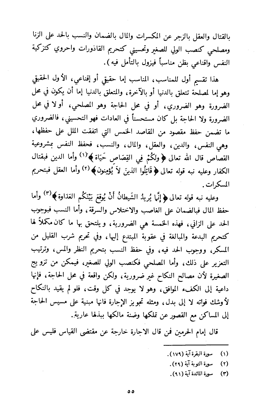 وعليه نبه قوله تعالى: {إِنَّمَا يُرِيدُ الشَّيْطَانُ أَنْ يُوقِعَ بَيْنَكُمُ الْعَدَاوَةَ٣} وأما حفظ المال فبالضمان على الغاصب والاختلاس والسرقة وأما النسب فبوجوب الحد على الزاني فهذه الخمسة هي الضرورية ويلتحق بها ما كان مكملا لها كتحريم البدعة والمبالغة في عقوبة المبتدع إليها وفي تحريم شرب القليل من المسكر ووجوب الحد فيه وفي حفظ النسب بتحريم النظر والمس وترتيب التعزير على ذلك وأما المصلحي فكنصب الولي للصغير فيمكن من تزويج الصغيرة لأن مصالح النكاح غير ضرورية ولكن واقعة في محل الحاجة فإنها داعية إلى الكفء الموافق وهو لا يوجد في كل وقت فلو لم يقيد بالنكاح لأوشك فواته لا إلى بدل ومثله تجويز الإجاره فإنها مبنية على مسيس الحاجة إلى المساكن مع القصور عن تملكها وضنة مالكها ببذلها عارية