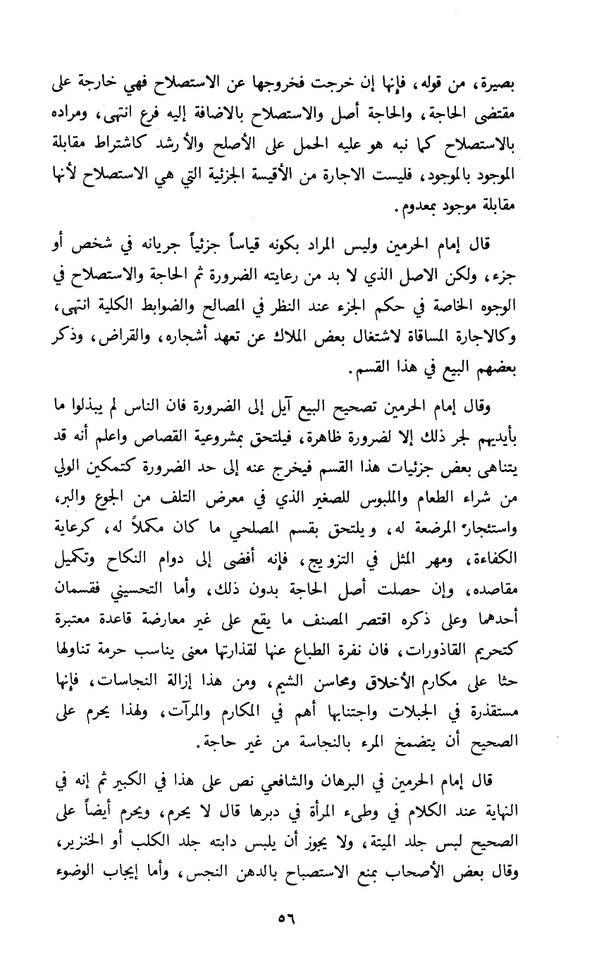 وقال إمام الحرمين تصحيح البيع آيل إلى الضرورة فإن الناس لم يبذلوا ما بأيديهم لجر ذلك إلا لضرورة ظاهرة فيلتحق بمشروعية القصاص واعلم أنه قد يتناهى بعض جزئيات هذا القسم فيخرج عنه إلى حد الضرورة كتمكين الولي من شراء الطعام والملبوس للصغير الذي في معرض التلف من الجوع والبر واستئجار المرضعة له ويلتحق بقسم المصلحي ما كان مكملا له كرعاية الكفاءة ومهر المثل في التزويج فإنه أفضى إلى دوام النكاح وتكميل مقاصده وإن حصلت أصل الحاجة بدون ذلك وأما التحسيني فقسمان أحدهما وعلى ذكره اقتصر المصنف ما يقع على غير معارضة قاعدة معتبرة كتحريم القاذورات فإن نفرة الطباع عنها لقذارتها معنى يناسب حرمة تناولها حثا على مكارم الأخلاق ومحاسن الشيم ومن هذا إزالة النجاسات فإنها مستقذرة في الجبلات واجتنابها أهم في المكارم والمرآت ولهذا يحرم على الصحيح أن يتضمخ المرء بالنجاسة من غير حاجة