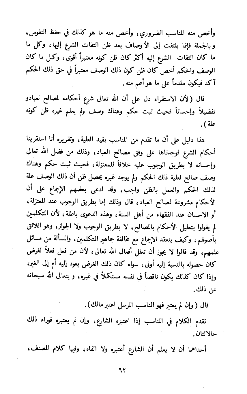 هذا دليل على أن ما تقدم من المناسب يفيد العلية وتقريره أنا استقرينا أحكام الشرع فوجدناها على وفق مصالح العباد وذلك من فضل الله تعالى وإحسانه لا بطريق الوجوب عليه خلافا للمعتزلة فحيث ثبت حكم وهناك وصف صالح لعلية ذلك الحكم ولم يوجد غيره يحصل ظن أن ذلك الوصف علة لذلك الحكم والعمل بالظن واجب وقد ادعى بعضهم الإجماع على أن الأحكام مشروعة لمصالح العباد قال وذلك إما بطريق الوجوب عند المعتزلة أو الإحسان عند الفقهاء من أهل السنة وهذه الدعوى باطلة لأن المتكلمين لم يقولوا بتعليل الأحكام بالمصالح لا بطريق الوجوب ولا الجواز وهو اللائق بأصولهم وكيف ينعقد الإجماع مع مخالفة جماهير المتكلمين والمسألة من مسائل علمهم وقد قالوا لا يجوز أن تعلل أفعال الله تعالى لأن من فعل فعلا لغرض كان حصوله بالنسبة إليه أولى سواء كان ذلك الغرض يعود إليه أم إلى الغير وإذا كان كذلك يكون ناقصا في نفسه مستكملا في غيره ويتعالى الله سبحانه عن ذلك
