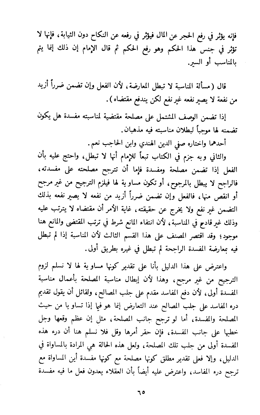 قال "مسألة المناسبة لا تبطل المعارضة لأن الفعل وإن تضمن ضررا أزيد من نفعة لا يصير نفعه غير نفع لكن يندفع مقتضاه"