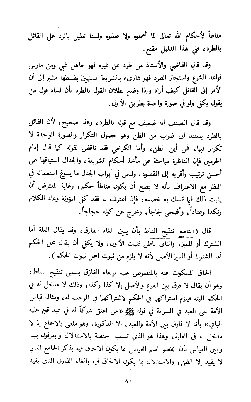 قال "التاسع تنقيح المناط بأن يبين إلغاء الفارق وقد يقال العلة أما المشترك أو المميز والثاني باطل فثبت الأول ولا يكفي أن يقال محل الحكم أما المشترك أو المميز الأصل لأنه لا يلزم من ثبوت المحل ثبوت الحكم"