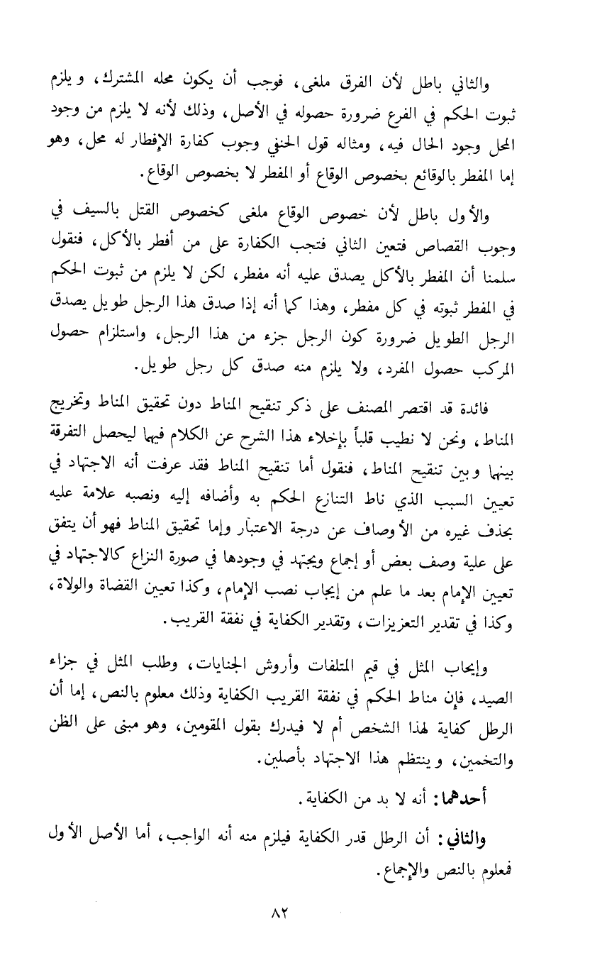 وإيجاب المثل في قيم المتلفات وأروش الجنايات وطلب المثل في جزاء الصيد فإن مناط الحكم في نفقة القريب الكفاية وذلك معلوم بالنص إما أن الرطل كفاية لهذا الشخص أم لا فيدرك بقول المقومين وهو مبنى على الظن والتخمين وينتظم هذا الاجتهاد بأصلين